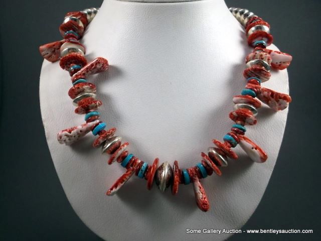 Red Coral and Turquoise and Sterling Silver Necklace-Marked w/ a Crowing Rooster Weight: 159.6 Grams