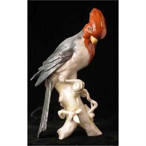Beautiful Red-Crested Cardinal figurine. Marked on the underside with an unidentified mark, possibly German. In very good used condition with minor restoration. Please ask questions, request additional photos and shipping costs before buying.