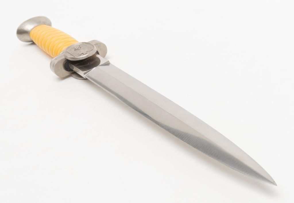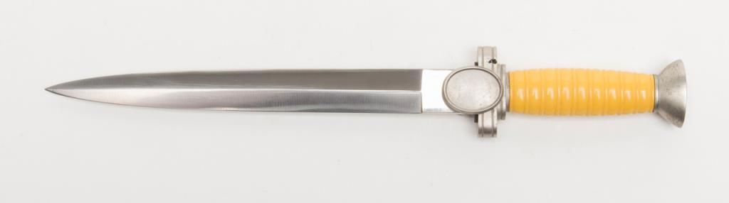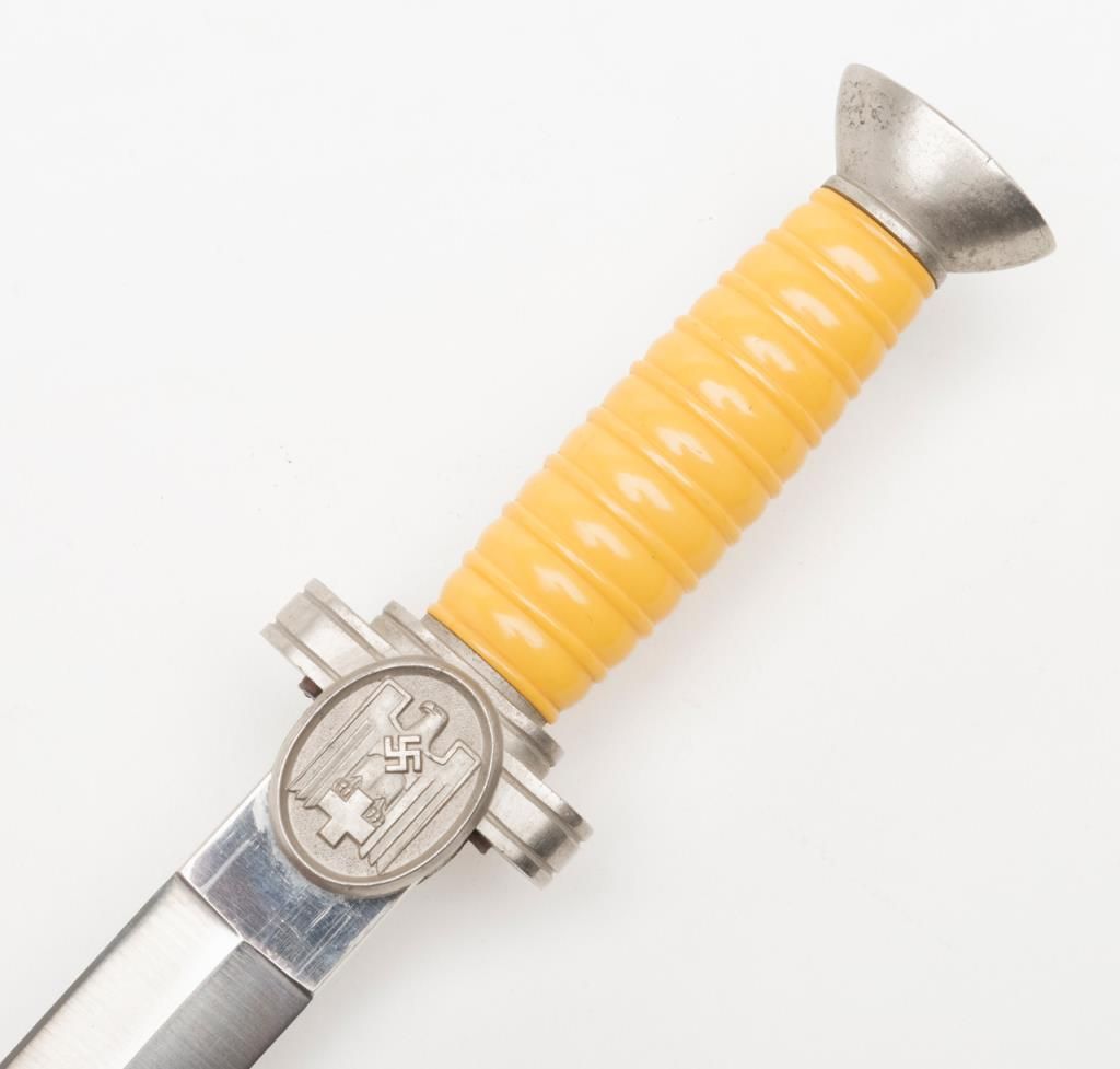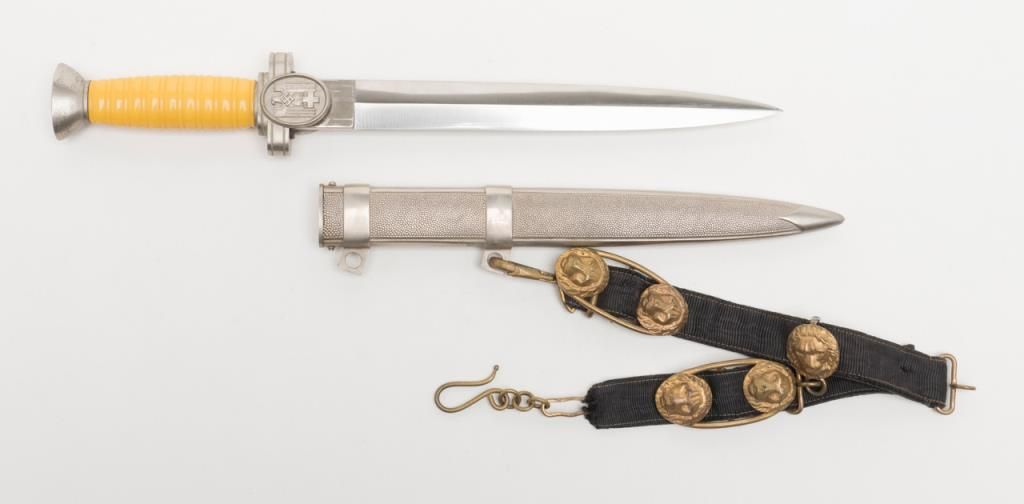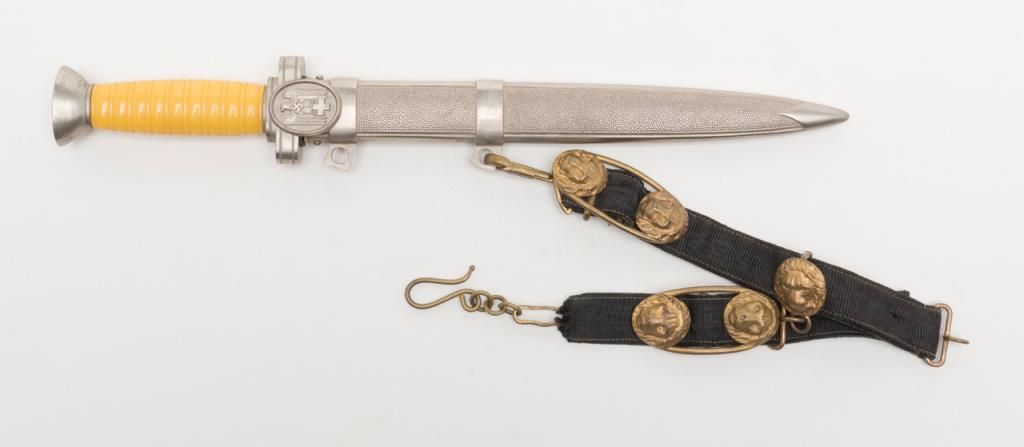 Red Cross leader’s dagger in very good plus to near fine original condition retaining incorrect naval hangers used by collector as display. The blade is near excellent although unmarked and the dagger is absolutely authentic with just someminor aging. Est.: $400-$800