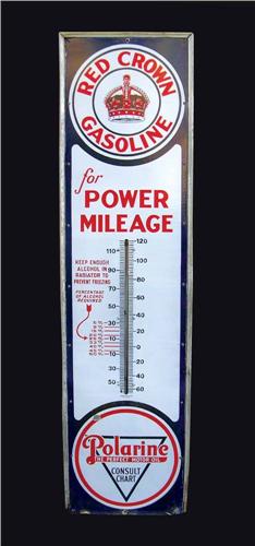Red Crown Gasoline and Polarine Porcelain Thermometer. Excellent condition. 18 X 73 inches.