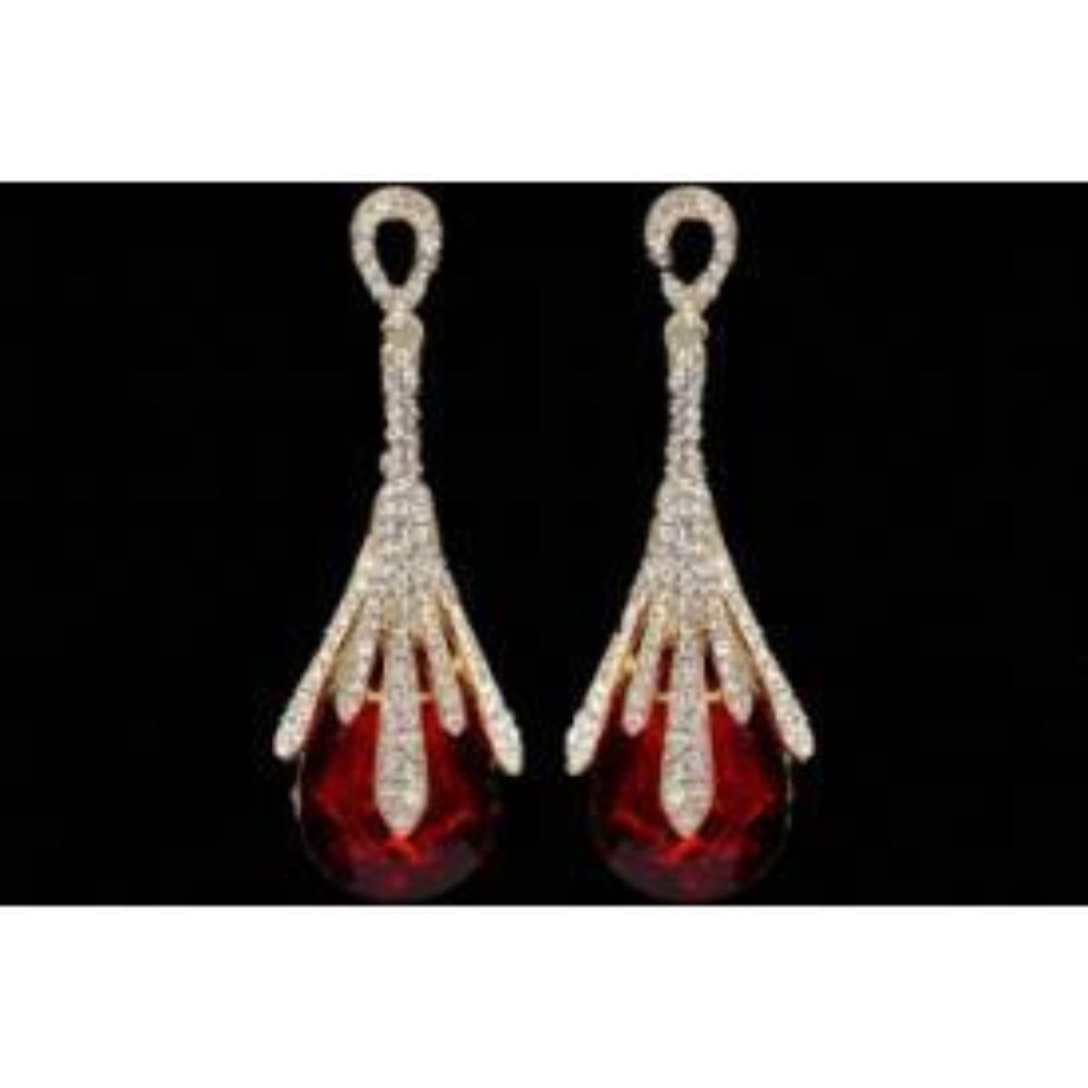 Red crystal & clear rhinestones set into 18kt gold plated costume drop dangle earrings. 2 1/2" L.Â