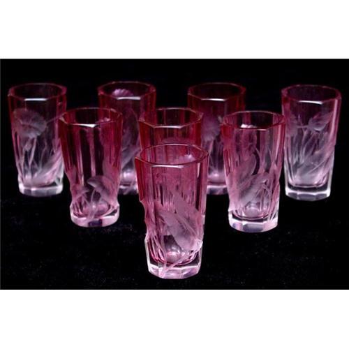 Charming set of eight cordial glasses made out of red / ruby colored glass decorated with hand-cut flowers. In good used condition with small signs of wear. Please ask questions, request additional photos and shipping costs before buying.