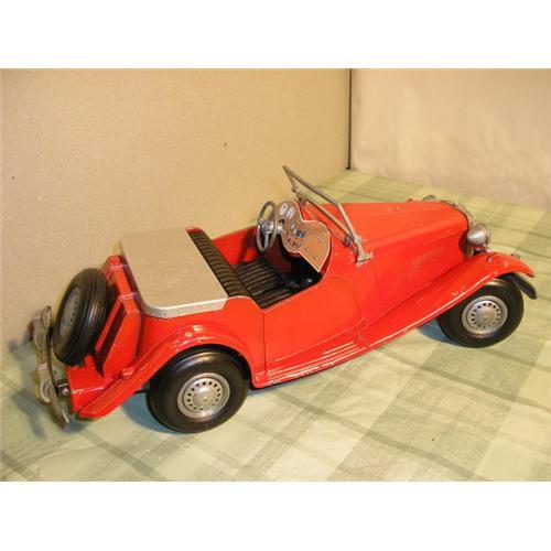 12"l, 7"h, 8'w, Paint has some chips. These cars came as kits or finished toys, this one believed to have come finished. Original, red, baked on paint, steering wheel, bumpers, spare tire, etc are all present and in good shape. Behind back seat is stamped: "Model Toys" Rossmoyne, OH U.S.A. Perfect for Doepke, model, toy, MG or car collectors.