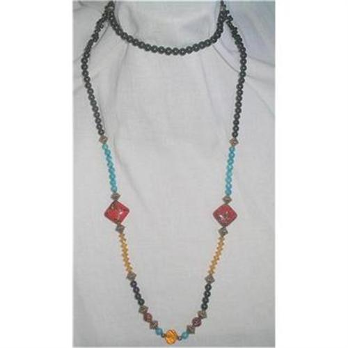 A stunning and eclectic mix of glass and lucite plastic. Two 3/4" inch square Diachronic glass beads in red with metallic copper blended and layered using semi-precious metals and fused glass together creating a amazing depth of colour and dimension. Two small round beads in the same red and copper diachronic glass mixed with Multi faceted smaller glass beads, turquoise color beads, black lucite beads and smaller black glass beads. Bronzed ornate spacers interspersed. Extra long length 0f 42" inches allows you to wear this necklace in many different styles. No closure it slips easily on and off over the head. Excellent condition.