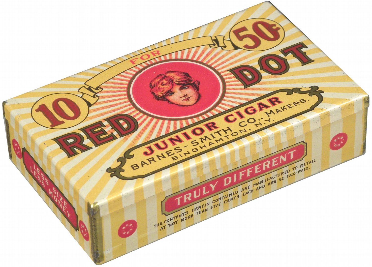 Red Dot Junior Cigars Square Corner Tin. Barnes-Smith Co. Makers. Binghamton, NY. Near mint condition. 4 3/4 X 1 1/4 X 3 inches.