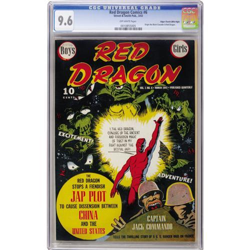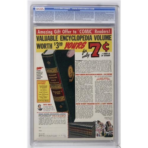 Considering the very collectible covers -- most very hard-hitting! -- this is an amazing series that's still a bit underrated. That may be because copies change hands fairly seldom: we hadn't seen this issue before except in a bound volume, and only three copies total appear on CGC's census as of this writing. This series' anti-Japanese propaganda covers are absolutely insane, particularly this one, which earned Overstreet's "classic" designation. Of course, a Golden Age comic with a black cover in this condition is an incredible find in itself. Overstreet 2006 NM- 9.2 value = $3,300. CGC census 12/06: 1 in 9.6, none higher.<BR><BR><b>Shipping:</b> Slabbed Comic (<a target="_blank" href="http://www.heritageauctions.com/common/shipping.php">view shipping information</a>)