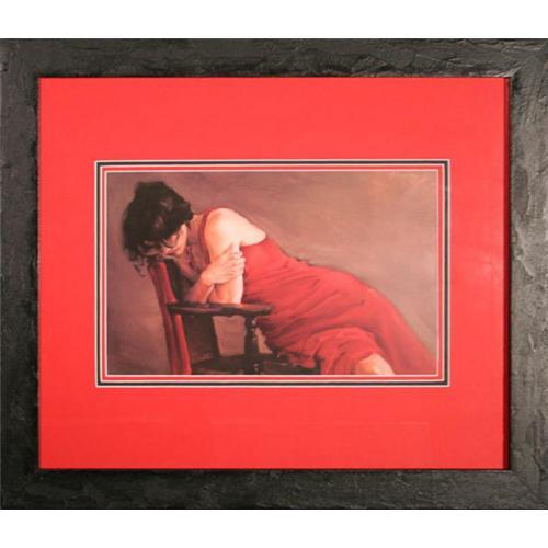 ?Red Dress? is a giclee print of Austin?s stunning original painting. In it a woman clad in a red dress reclines on the edge of a chair, face hidden by her cascading hair. His long, swift brushstrokes bring the folds of the fabric to life with subtle shifts of light and dark. The dramatic use of light creates high contrast between the point at which it hits the woman?s shoulder and the deep shadows within the chair below. The delicacy of her features were rendered with amazing precision from her small hand to the wisps of hair surrounding her face. Austin was quoted as saying, ?No matter what the medium or content, a work of art must have a spirit. It cannot rely upon gimmick or fashion; it must live and breathe on its own. It is a subtle thing and a sublime thing.? This ...