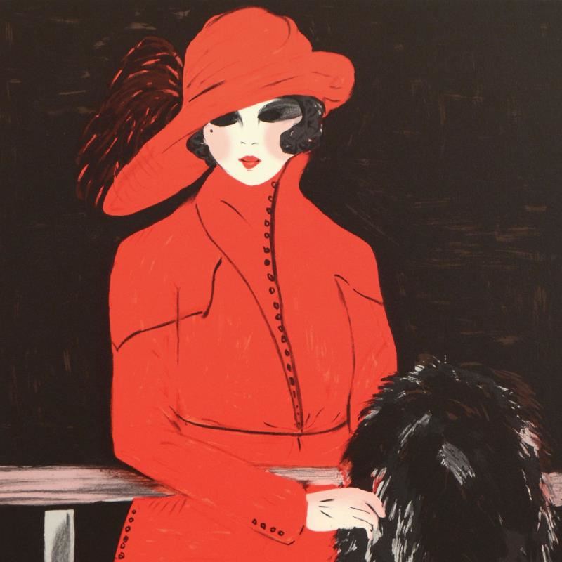 "Red Dress" is a limited edition lithograph on paper by Louise Solomon, numbered and hand signed by the artist! Measures approx. 21.5" x 30" (border). 18" x 26" (image).