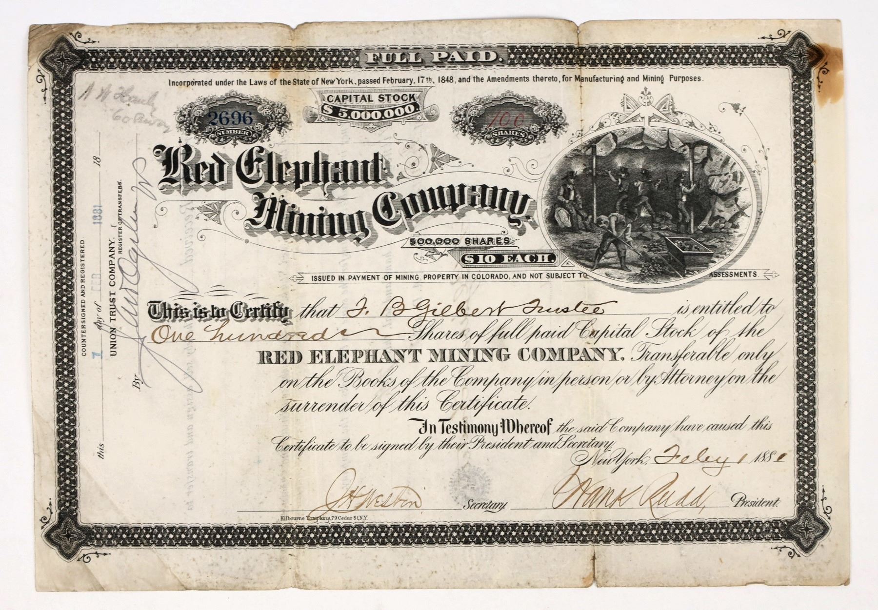 Extremely rare stock certificate from the Red Elephant Mining Company for 100 shares, 1881. Mining vignette. The Red Elephant group consisted of the Red Elephant, Boulder Nest, Free American, St. James, Tabor and White Mines. The camp of Red Elephant, located on Red Elephant Mt. one mile above Lawson, contained a post office, commissary, and several miners’ boarding houses and cabins. Peak population was about 300. The property has 5 shafts 230 to 700 ft. deep with 3 to 13 levels.