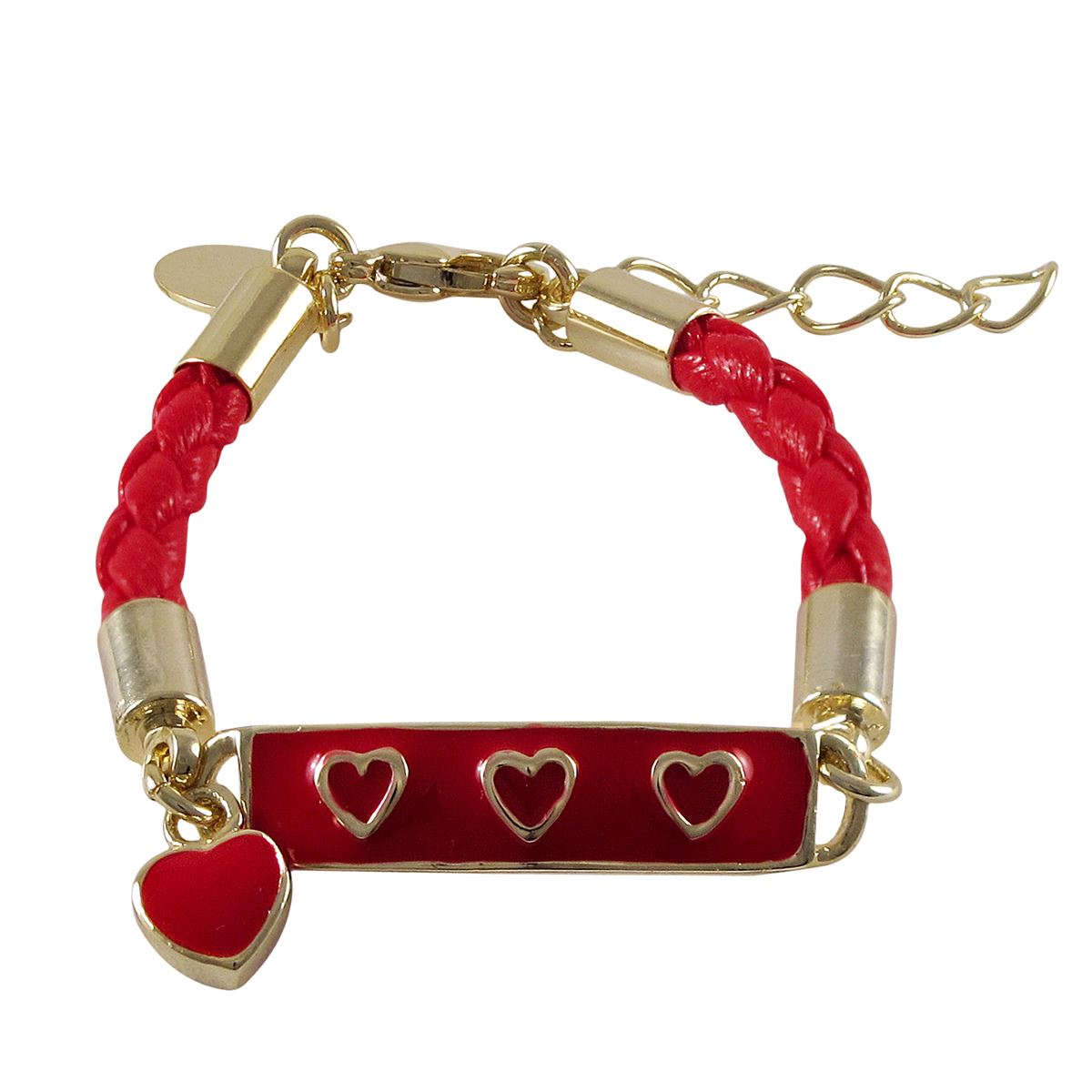 Red Enamel Bar With Red Hearts, Red Cord Gold Plated Brass Bracelet, 4" 1"