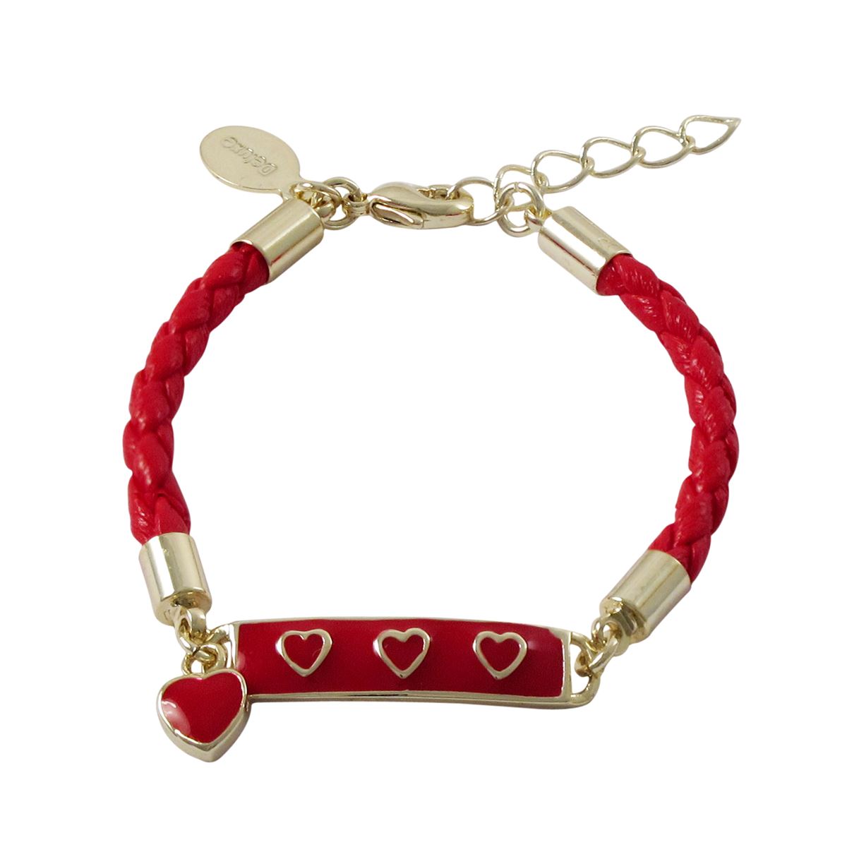 Red Enamel Bar With Red Hearts, Red Cord Gold Plated Brass Bracelet, 5" 1"