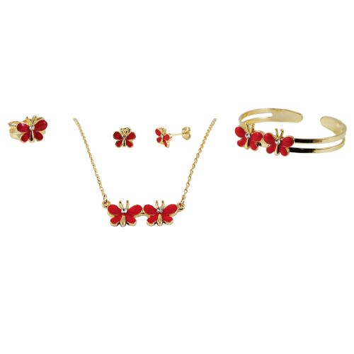 Red Enamel Butterfly Gold Brass Necklace, Earring, Bracelet & Ring Set