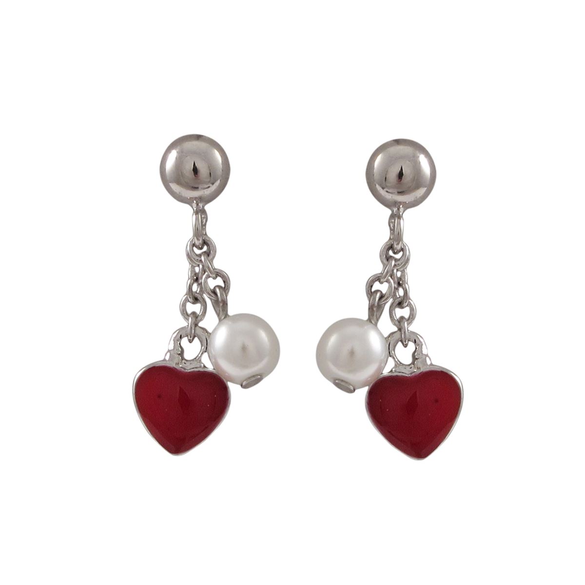 Red Enamel Heart, 4Mm White Pearl, Sterling Silver Post Earrings