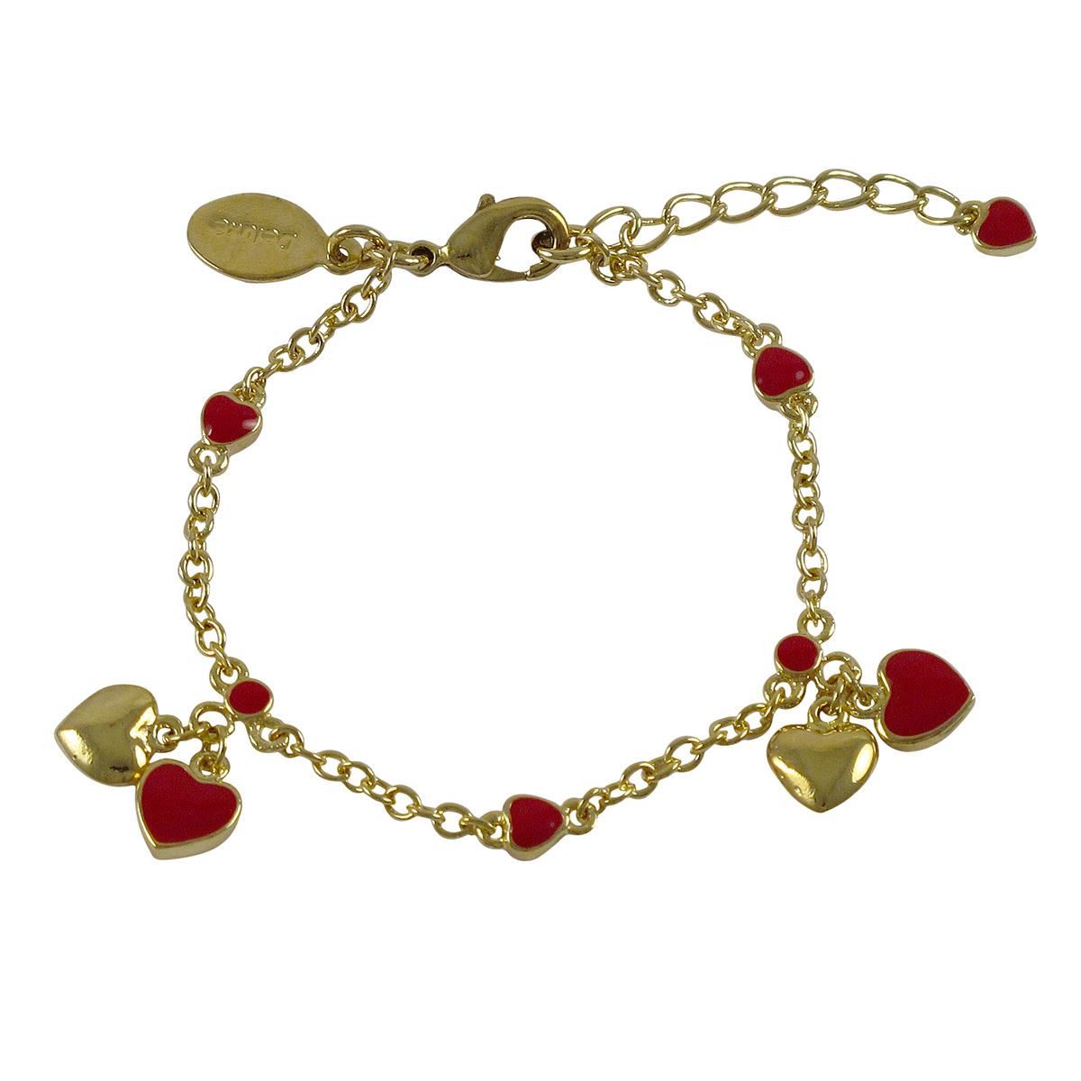 Red Enamel Heart Charms On A Gold Tone Brass Bracelet, 5" 1"