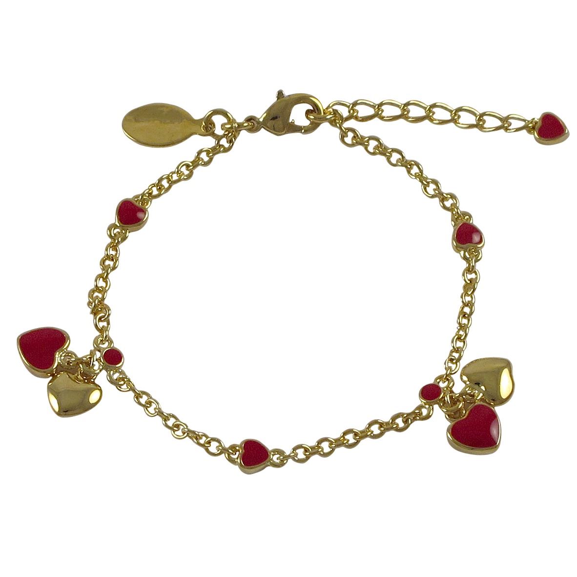 Red Enamel Heart Charms On A Gold Tone Brass Bracelet, 6" 1"