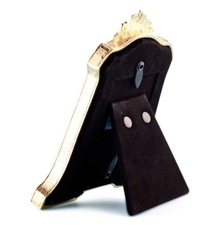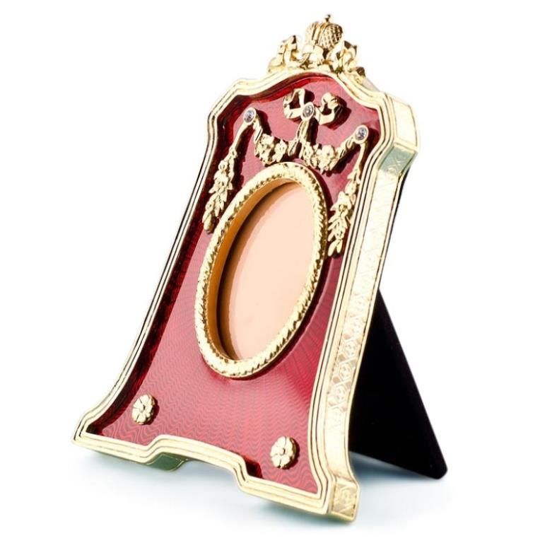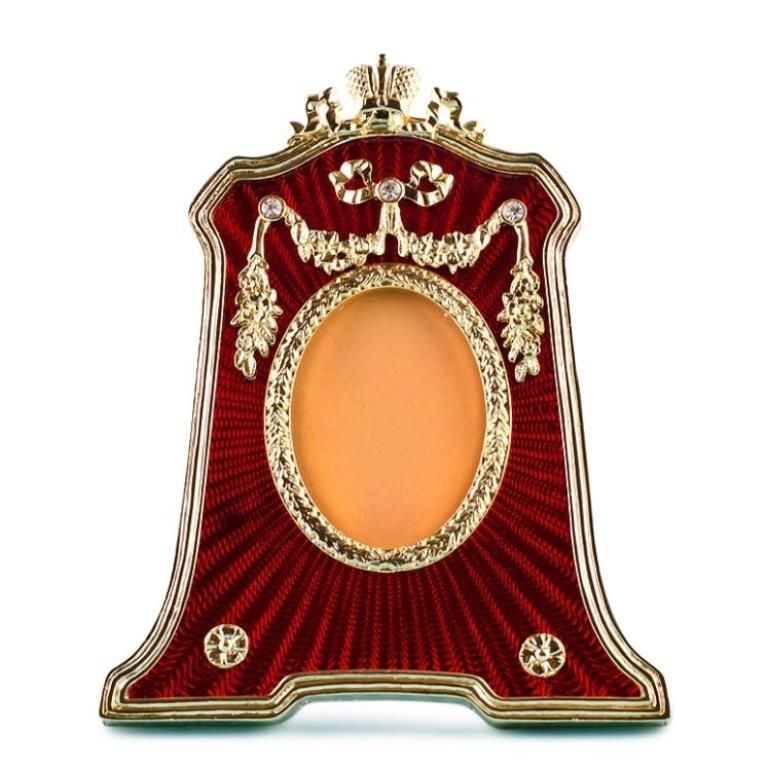 Red Enameled Guilloche Faberge Inspired Frame, Dimensions: 4.5'' (H) x 3.75'' (L) Photo Opening Dimensions: 1.75" (H) 1.25" (W) Pewter, Enamel, Crystals