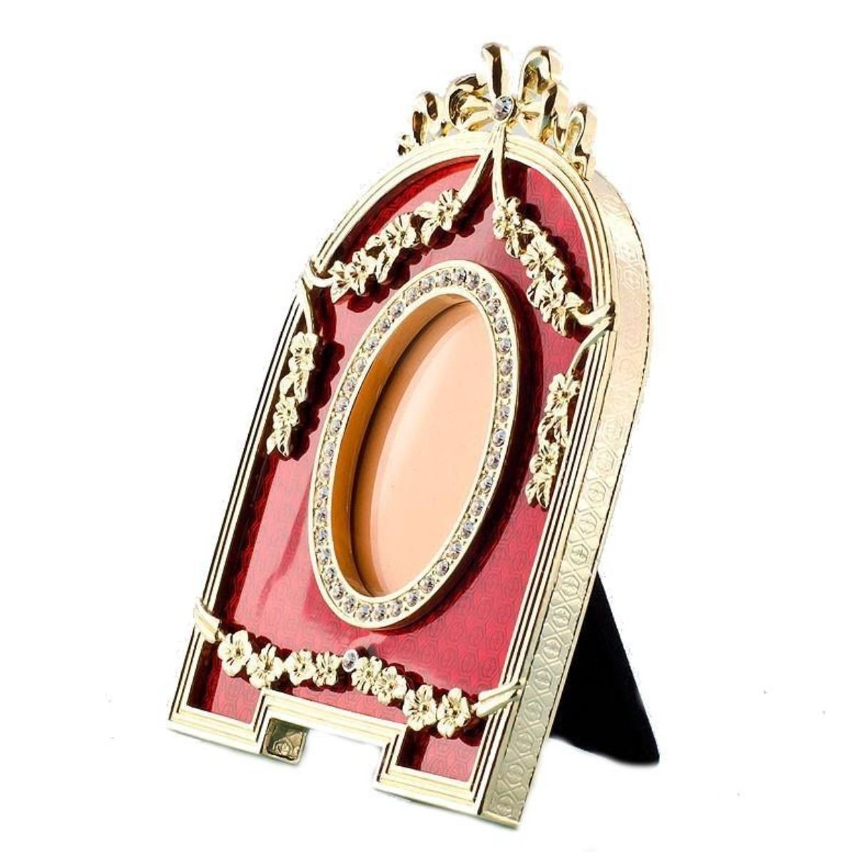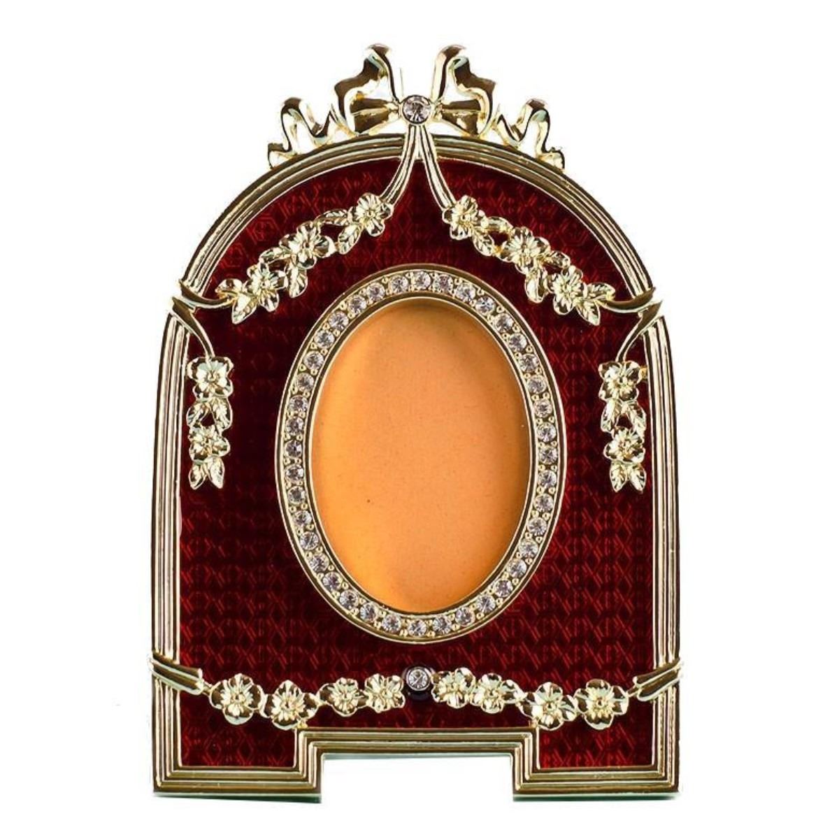 Red Enameled Semicircular Faberge Picture Frame Features:Dimensions: 5'' (H) x 3.5'' (L)Photo Opening Dimensions: 2" (H) 1.25" (W)Pewter, Enamel, Crystals Gift Boxed Faberge Eggs have a remarkable story and while the original Faberge eggs are virtually priceless, extraordinary re-creations of Carl Faberge’s works are not only fabulous to look at but wonderful to own and collect. You ask the question, “how much would an original Carl Faberge egg cost in today’s marketâ€. Here’s a story that will give you that answer: Los Angeles Times: “A Faberge egg found at a flea market by a scrap-metal dealer who initially didn't realize the value of what he had discovered will be on public view for the first time in more than a century, according to a British art and antiques dealer. The egg, thought to have been made in the late 19th century for Russian royalty, was purchased years ago at a U.S. flea market for just $14,000, said the antiques dealer, Wartski. The buyer was interested in the item for its gold content but later suspected the piece might be even more valuable. The egg was later sold to a private collector. The identities of the buyer and seller haven't been revealed. Wartski didn't disclose how much was paid for the egg, but some estimates put its value as high as $33 million. It will be on display at Wartski in London from April 14 to 17.†The first Faberge egg was crafted for Tsar Alexander III, who had decided to give his wife, the Empress Maria Fedorovna, an Easter egg in 1885, possibly to celebrate the 20th anniversary of their betrothal. Although there is no official record of the Tsar's inspiration for it, many believe that he was moved by an egg owned by the Empress’s aunt, Princess Vilhelmine Marie of Denmark, which had captivated Maria’s imagination in her childhood and of which the Tsar was well aware. Known as the Hen Egg, the very first Faberge egg is crafted from a foundation of gold. Its opaque white enameled "shell" opens to reveal a matte yellow-gold yolk. This in turn opens to reveal a multicolored gold hen that also opens. The hen contained a minute diamond replica of the imperial crown from which a small ruby pendant was suspended, but these last two elements have been lost.[2] Maria was so delighted by the gift that Alexander appointed Faberge a "goldsmith by special appointment to the Imperial Crown" and commissioned another egg the next year. After that, Peter Carl Faberge was apparently given complete freedom for the design of future imperial Easter eggs, and their designs became more elaborate. According to Faberge family lore, not even the Tsar knew what form they would take—the only requirements were that each contain a surprise, and that each be unique. Once Faberge had approved an initial design, the work was carried out by a team of craftsmen, among them Michael Perkhin, Henrik Wigstrom and Erik August Kollin.[citation needed] After Alexander III's death on 1 November 1894, his son, Nicholas II, presented a Faberge egg to both his wife, Alexandra Fedorovna, and his mother, the Dowager Empress Maria Fedorovna. Records have shown that of the 50 imperial Easter eggs, 20 were given to the former and 30 to the latter. Eggs were made each year except 1904 and 1905, during the Russo-Japanese War.[3] The imperial eggs enjoyed great fame, and Faberge was commissioned to make similar eggs for a few private clients, including the Duchess of Marlborough, the Rothschild family and the Yusupovs. Faberge was also commissioned to make twelve eggs for the industrialist Alexander Kelch, though only seven appear to have been completed.[1] Following the revolution and the nationalization of the Faberge workshop in St. Petersburg by the bolsheviks in 1918, the Faberge family left Russia. The Faberge trademark has since been sold several times and several companies have retailed egg-related merchandise using the Faberge name. The Victor Mayer jewelry company produced limited edition heirloom quality Faberge eggs authorized under Unilever's license from 1998 to 2009. The trademark is now owned by Faberge Limited, which makes egg-themed jewellery.[4] In 2015 the owners of this trademark announced the creation of a new "Faberge" egg, one styled by them as belonging to the "Imperial Class" of eggs and therefore the first Imperial-Class egg in 100 years: the Faberge Pearl egg is to be sold in Qatar following a five-day exhibition some time in 2017. A spokesperson for the brand said it expected the egg to fetch at least two million US dollars, possibly much more. Despite its designation as "Imperial", it has no connection to Imperial Russia and instead has become closely tied to wealthy Arab ruling families of various Gulf Nations.[5] Its motif has been described as "scalloped", but the patterns of its curves and lines are also clearly derived from the girih and arabesque of Islamic interlace patterns, and each of its six vertical segments includes a stylized pointed dome and associated pendentives reminiscent of the onion dome and ceiling of an Arabic mosque. The celebrated series of 50 Imperial Easter eggs was created for the Russian Imperial family from 1885 to 1916 when the company was run by Peter Carl Faberge. These creations are inextricably linked to the glory and tragic fate of the last Romanov family. They were the ultimate achievement of the renowned Russian jewelry house and must also be considered the last great commissions of objets d’art . Ten eggs were produced from 1885 to 1893, during the reign of Emperor Alexander III; 40 more were created during the rule of his dutiful son, Nicholas II, two each year, one for his mother, the dowager, the second for his wife. The series began in 1885 when Emperor Alexander III, through the intermediary of his uncle, Grand Duke Vladimir, commissioned an Easter egg from Faberge as an Easter present for his wife, Empress Maria Feodorovna. Initially planned by Faberge to contain a diamond ring, the actual finished