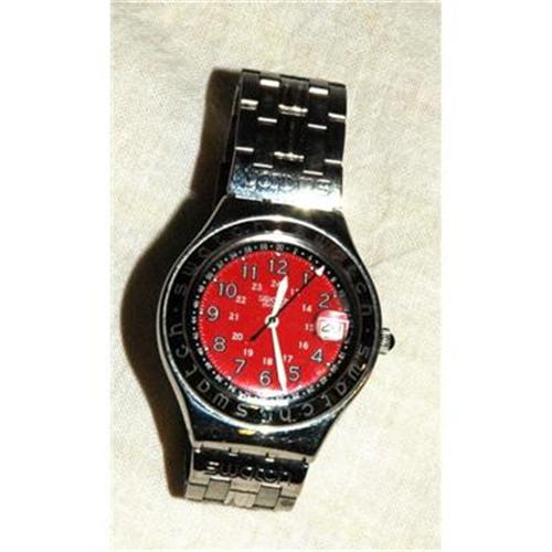 Excellent Large Red Dial Men's Swatch "Irony" Watch that is water resistant. It is stainless steel case and band with "Swatch embossed on the bezel as well as the band. The watch is in excellent condition. for a used watch. There are a few scrathes on the buckle surface. The crystal has a few microscopic scratches that can only be seen under high magnification of a jewelers loop. It work excellently and comes with a brand new working quartz battery. The are some specks that appear in the picture however these are cause from the camera and reflection from the lights.