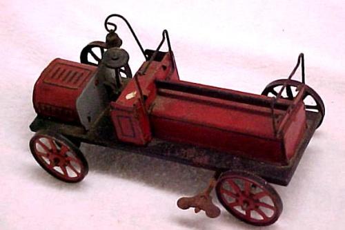 Red Fire Truck; tin wind-up toy, no maker's mark, 6"across, some rust on body and winding key;