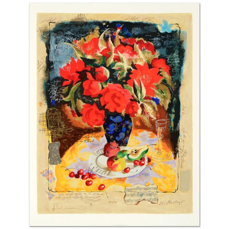 "Red Flowers in a Vase" is a limited edition serigraph on paper by Tanya Wissotzky (1959-2006) and Alexander Galtchansky (1959-2008), numbered and hand signed by the artists. Includes Certificate of Authenticity! Measures approx. 18" x 23.5 (with border), 16" x 21" (no border).