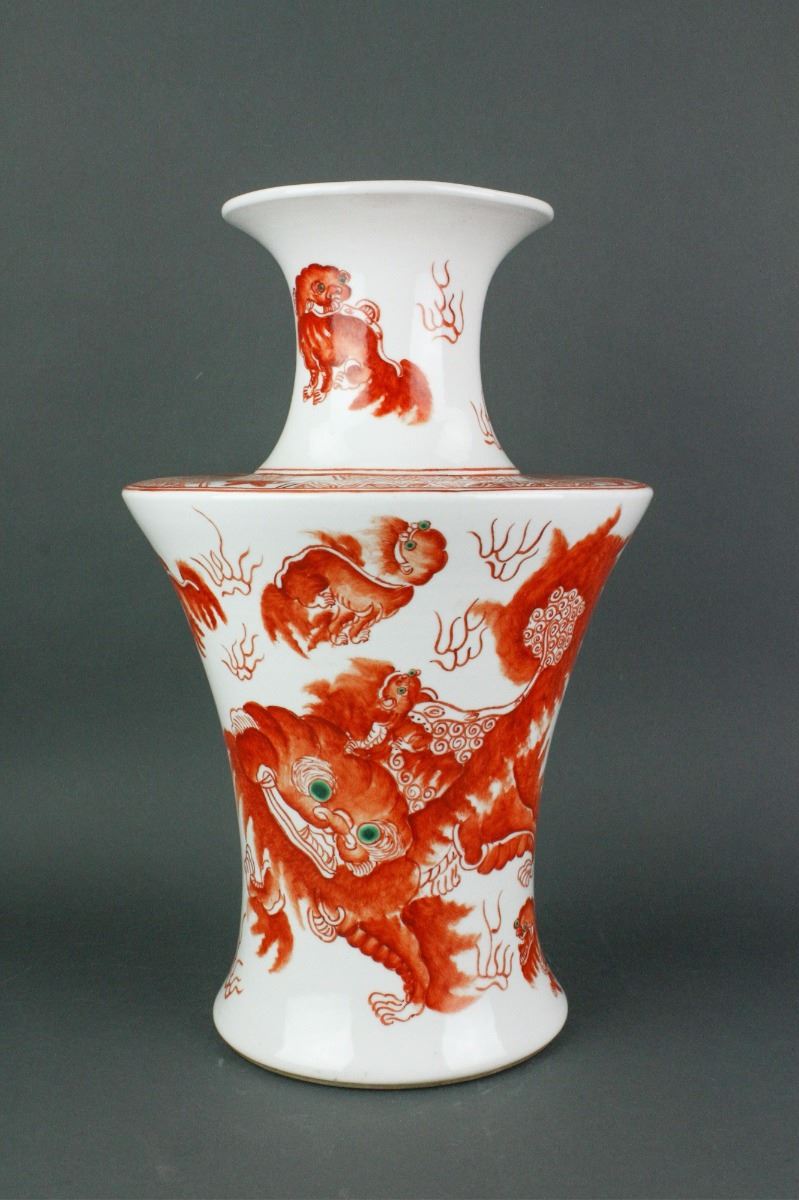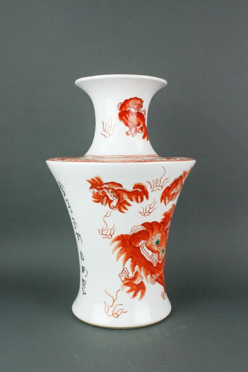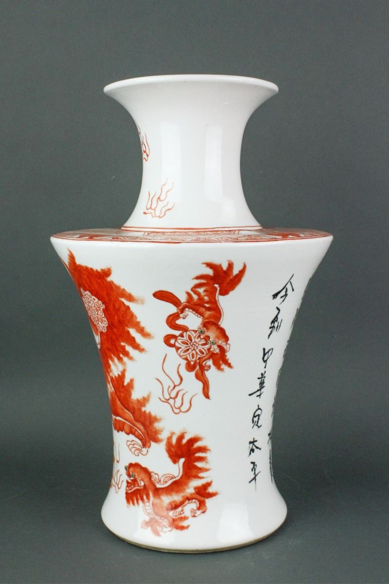 Chinese copper red porcelain vase; of curved cylindrical body connecting to an angled shoulder and waisted neck with everted rim; painted with Fu dog with its cubs; with calligraphy on side; four-character Tongzhi mark on base; H: 41 cm, D: 27 cm, 3154 grams