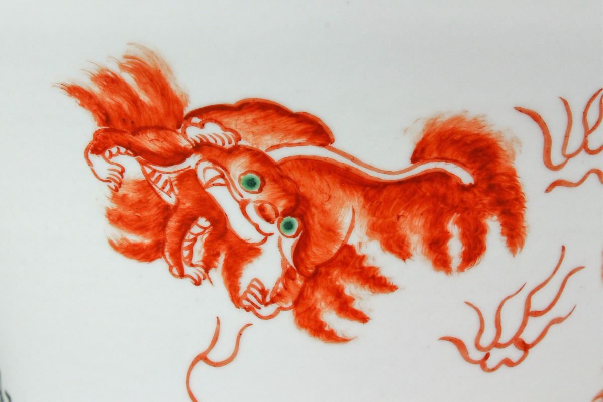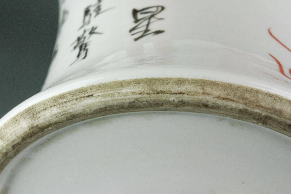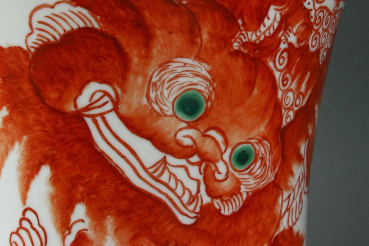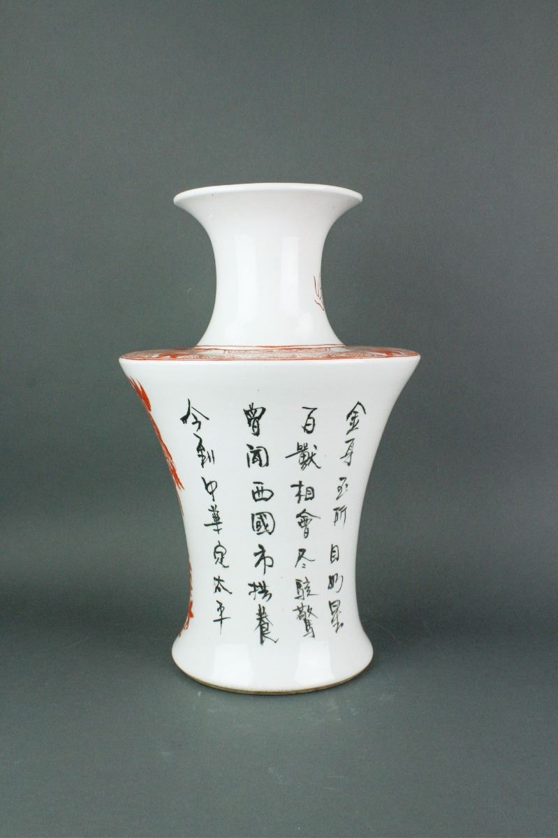 Chinese copper red porcelain vase; of curved cylindrical body connecting to an angled shoulder and waisted neck with everted rim; painted with Fu dog with its cubs; with calligraphy on side; four-character Tongzhi mark on base; H: 41 cm, D: 27 cm, 3154 grams