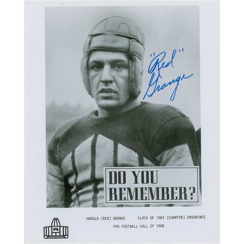 Glossy 8 x 10 Pro Football Hall of Fame photo of 'The Galloping Ghost' during his playing years, signed in blue felt tip, "'Red' Grange." In fine condition, with a few small surface creases.