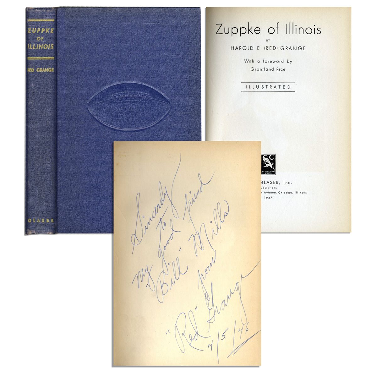Harold E. ''Red'' Grange signed biography of University of Illinois football coach Robert Zuppke, ''Zuppke of Illinois'' published by A.L. Glaser: Chicago: 1937. One of the greatest players in the history of college football inscribes the whole of the front free endpaper in blue ink: ''Sincerely / to / my good friend / 'Bill' Mills / from / Red Grange / 4/5/46''. Grange and Zuppke were a winning combination, both becoming College Football Hall of Famers, and the halfback's perspective on the coach's life story is straightforward and thought-provoking. Runs 179pp. Bound in navy blue cloth boards with a football imprint to the front board. Measures 5.75'' x 8.25''. Light toning and scattered staining to tail edge of leaves. Wear to spine edges and upper board corners. In very good condition.