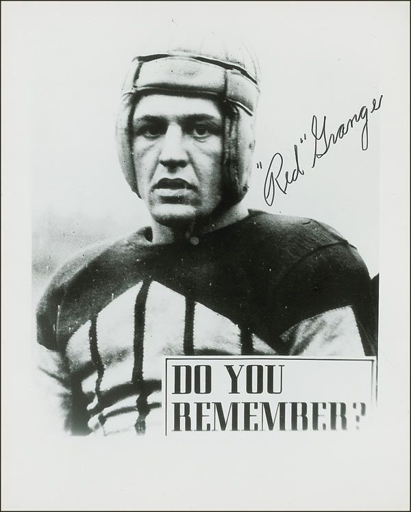 Glossy 8 x 10 photo of Grange in his football uniform and leather helmet, signed in black felt tip. In fine condition.