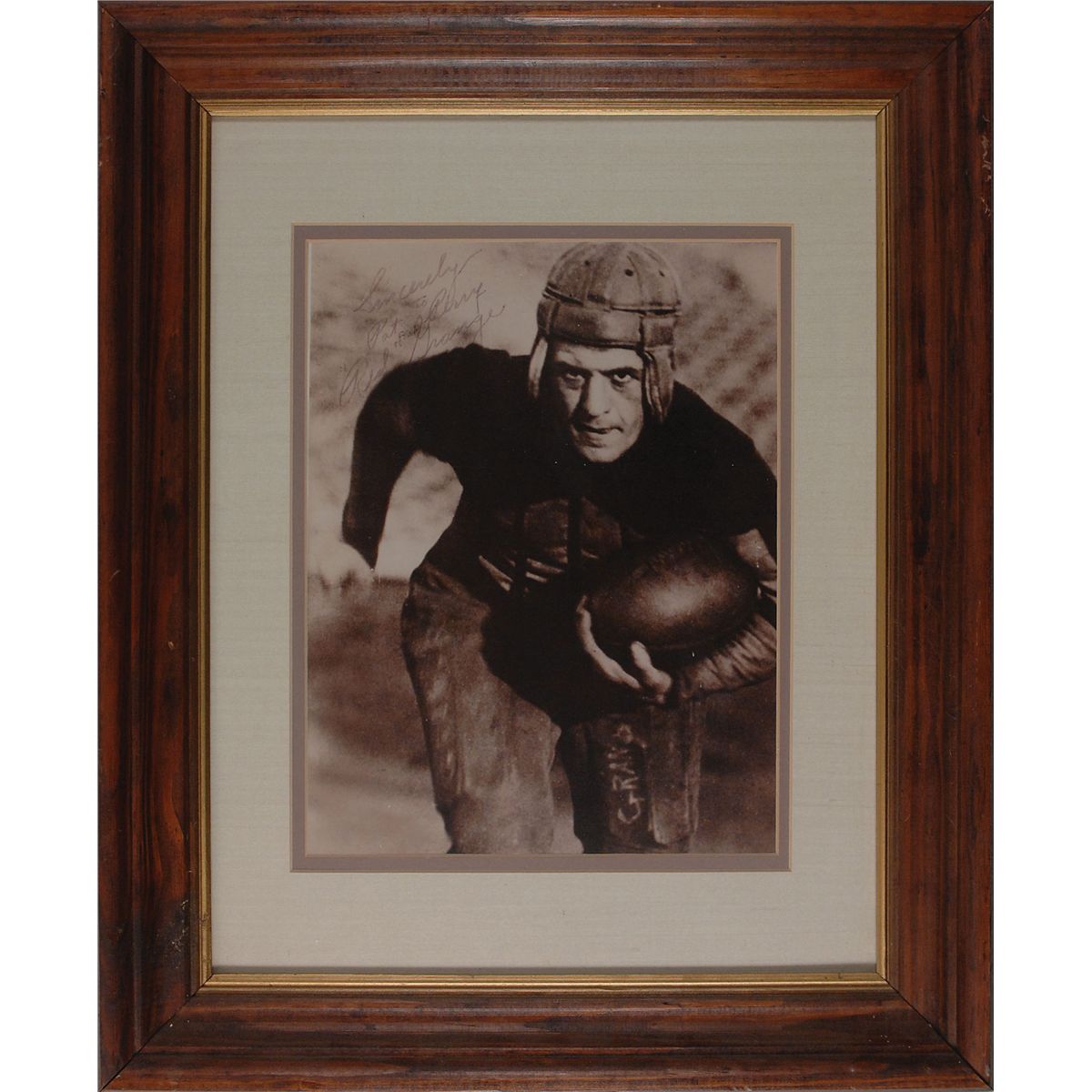 Great 9.5 x 12.5 cardstock photo of Grange running with the football, signed and inscribed in black felt tip, “Sincerely, to Pat Perry, from ‘Red’ Grange.” Attractively double-cloth-matted and framed to an overall size of 17.75 x 21.75. In fine condition, with signature and inscription slightly faded.