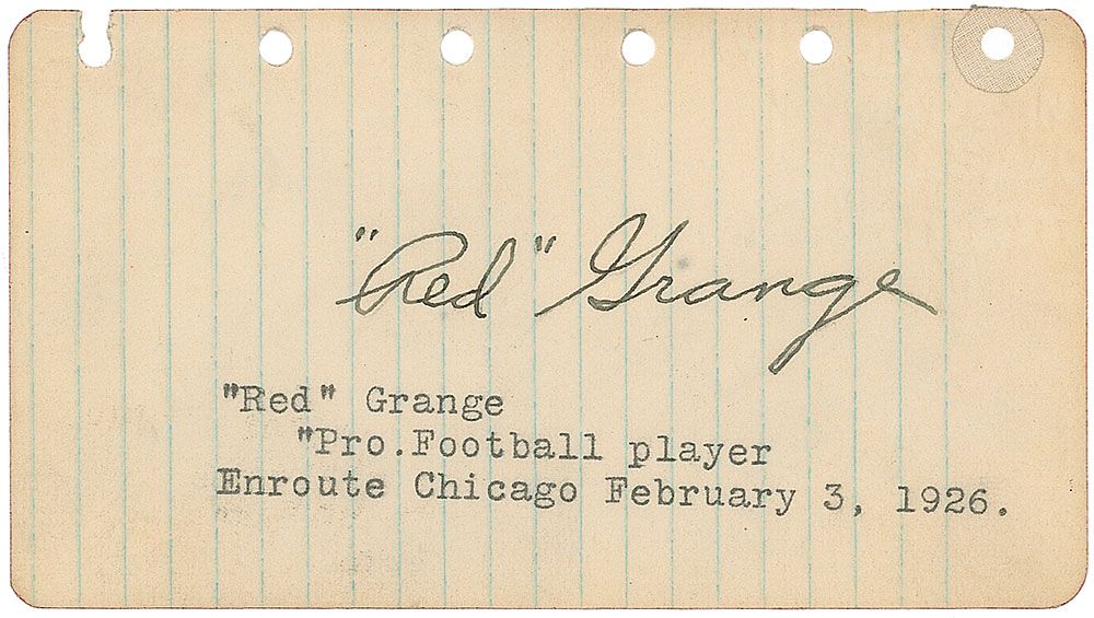 Vintage fountain pen signature, “‘Red’ Grange,” on an off-white 4.5 x 2.5 lined page. Even overall toning and a small tear and reinforcement to binding holes, otherwise fine condition.