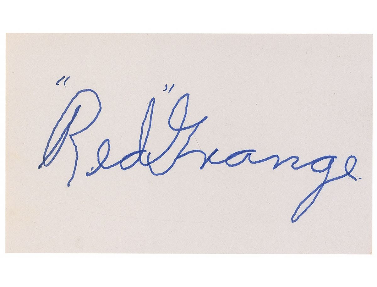 Felt tip signature, “‘Red’ Grange,” on an off-white 5 x 3 card. In fine condition.