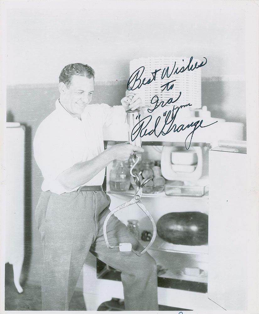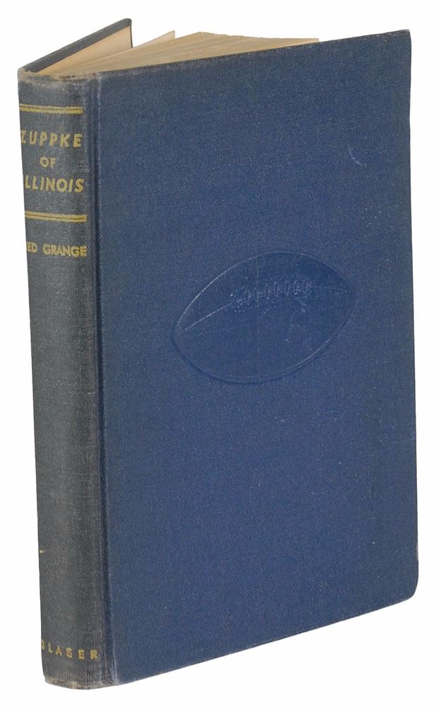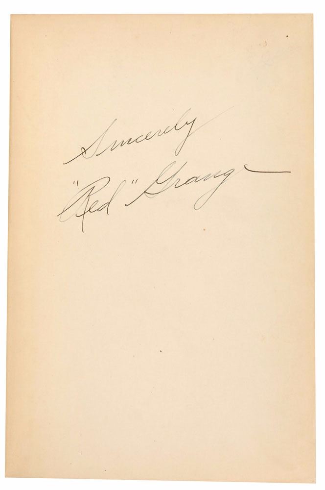 Legendary football halfback (1903–1991) nicknamed 'The Galloping Ghost.' Two items: a hardcover first edition of Zuppke of Illinois, published by A. L. Glaser in 1937, signed and inscribed on the first free end page in fountain pen, "Sincerely, 'Red' Grange"; and a glossy 8 x 9.75 photo of Grange, signed and inscribed later in black felt tip, "Best Wishes to Ira, from 'Red' Grange." In overall fine condition, with some light wear to exterior of the book, a slightly loosened front hinge, and expected yellowing to textblock; and a trimmed bottom edge to the photo.
