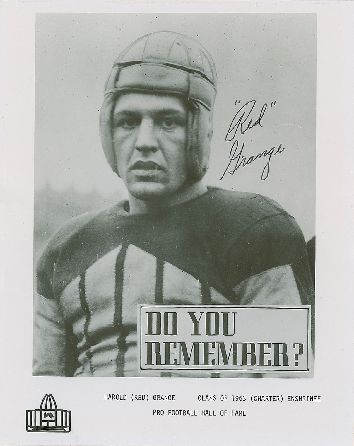 Glossy 8 x 10 photo of the 'Galloping Ghost' wearing his football uniform in an imposing head-and-shoulders pose, signed in black felt tip by Red Grange. In fine condition.