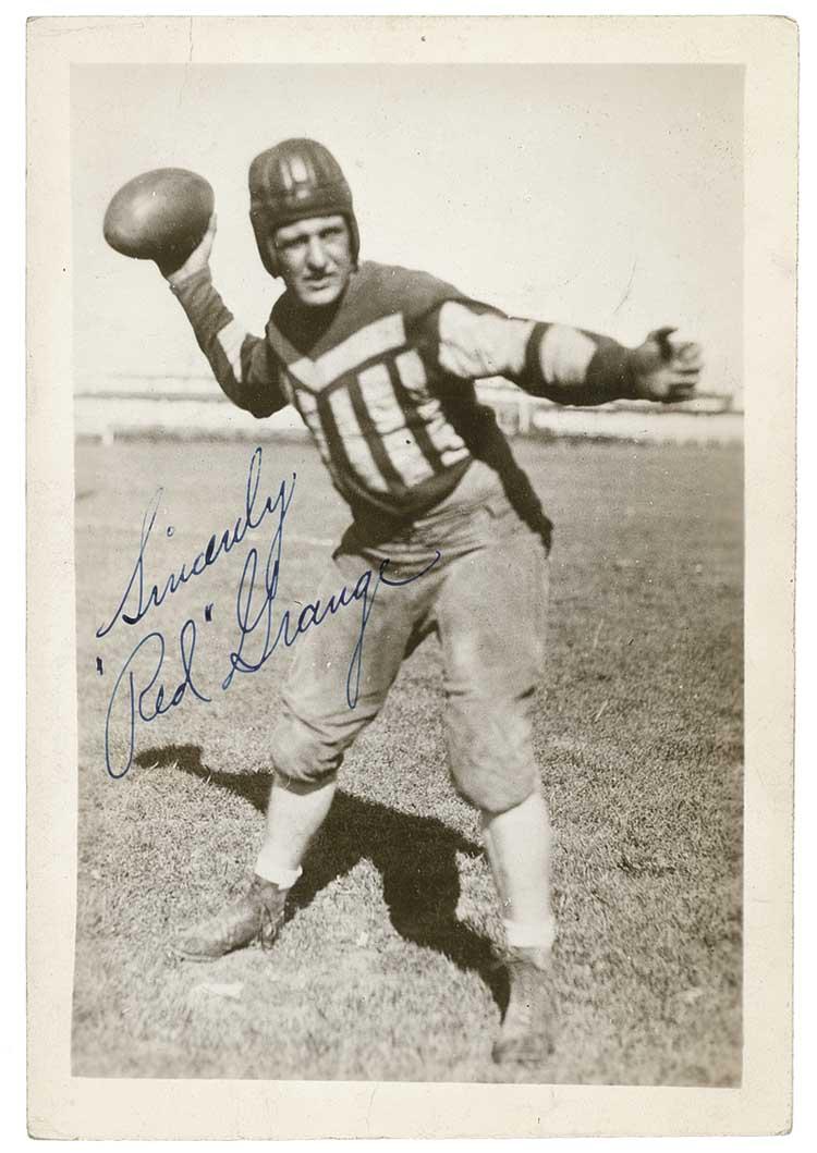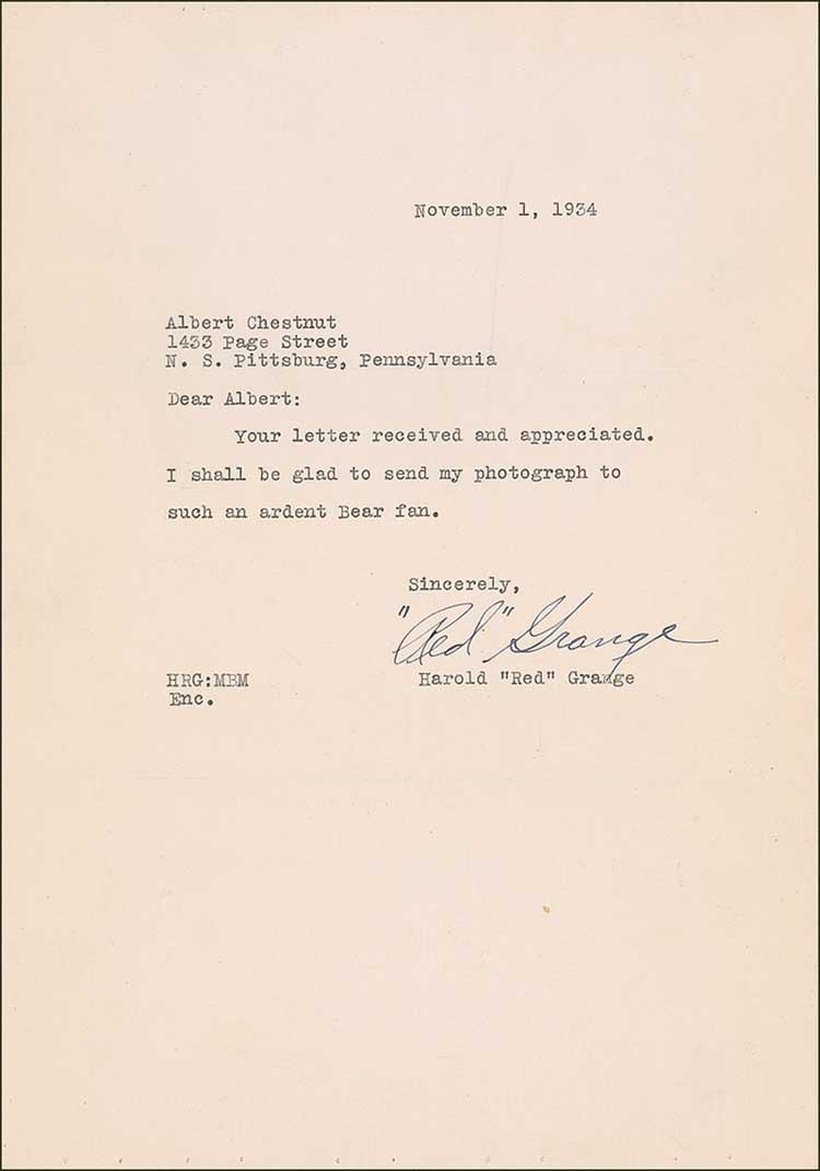Two items: TLS, one page, 7.25 x 10.25, November 1, 1934. A brief transmittal letter to send a signed photograph “to such an ardent Bear fan.” Accompanied by the referenced vintage pearl-finish 5 x 7.25 signed photo of Grange about to throw a football. In fine condition, with some faint toning to the letter and some light creasing to the photo. Pre-certified Steve Grad/PSA/DNA and RRAuction COA.