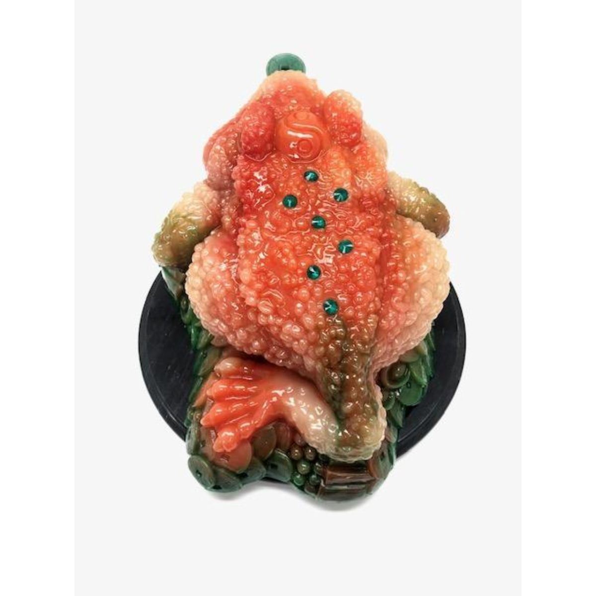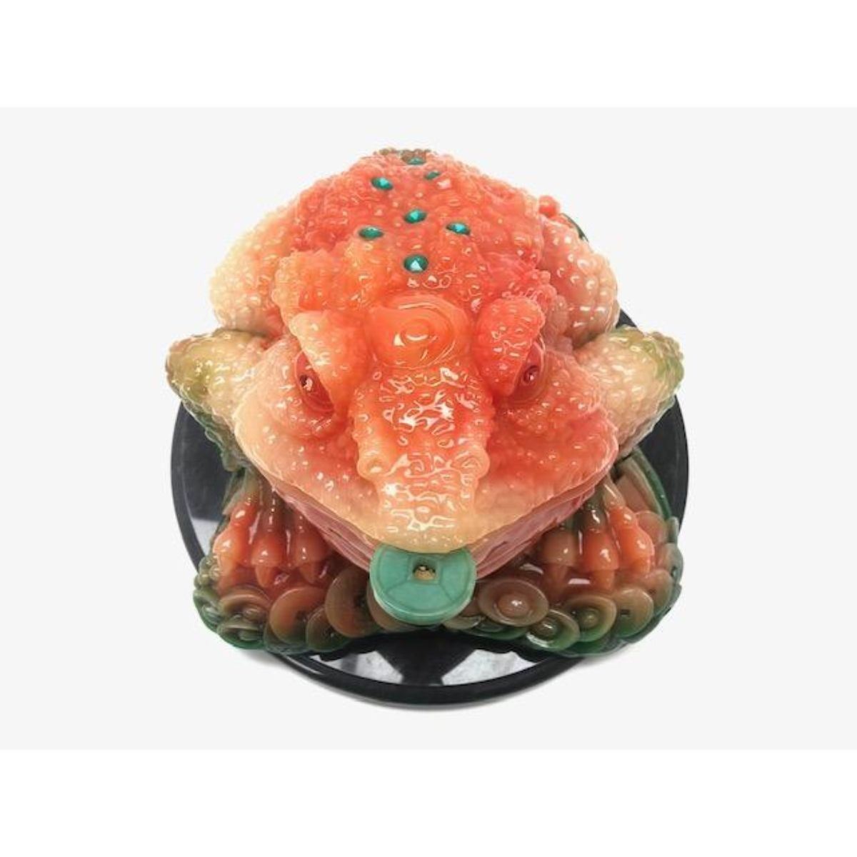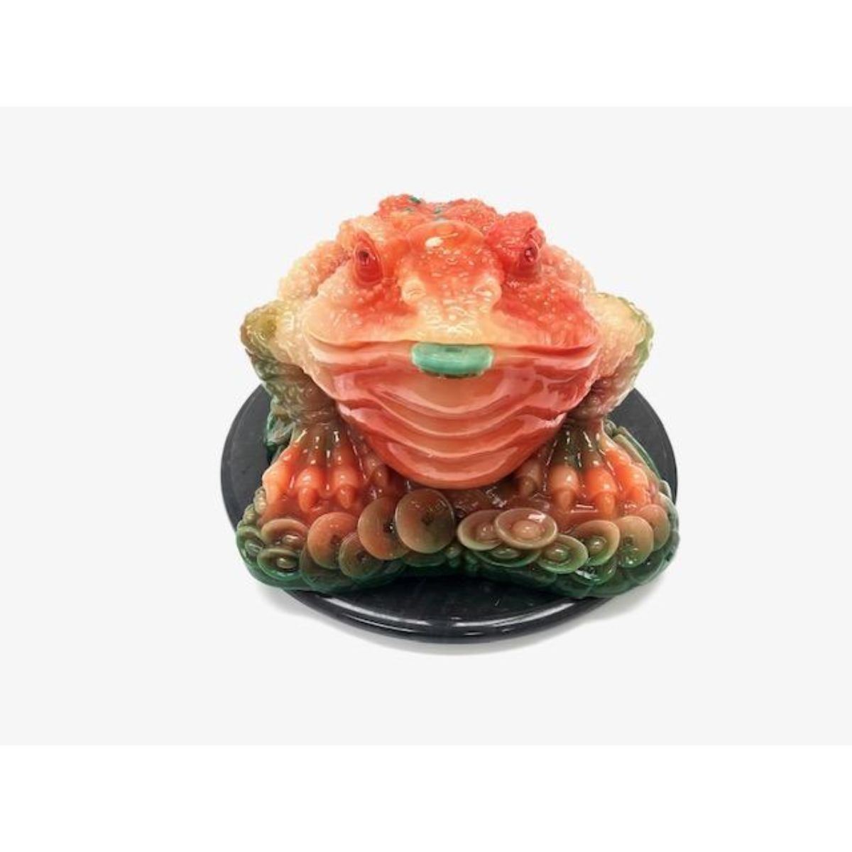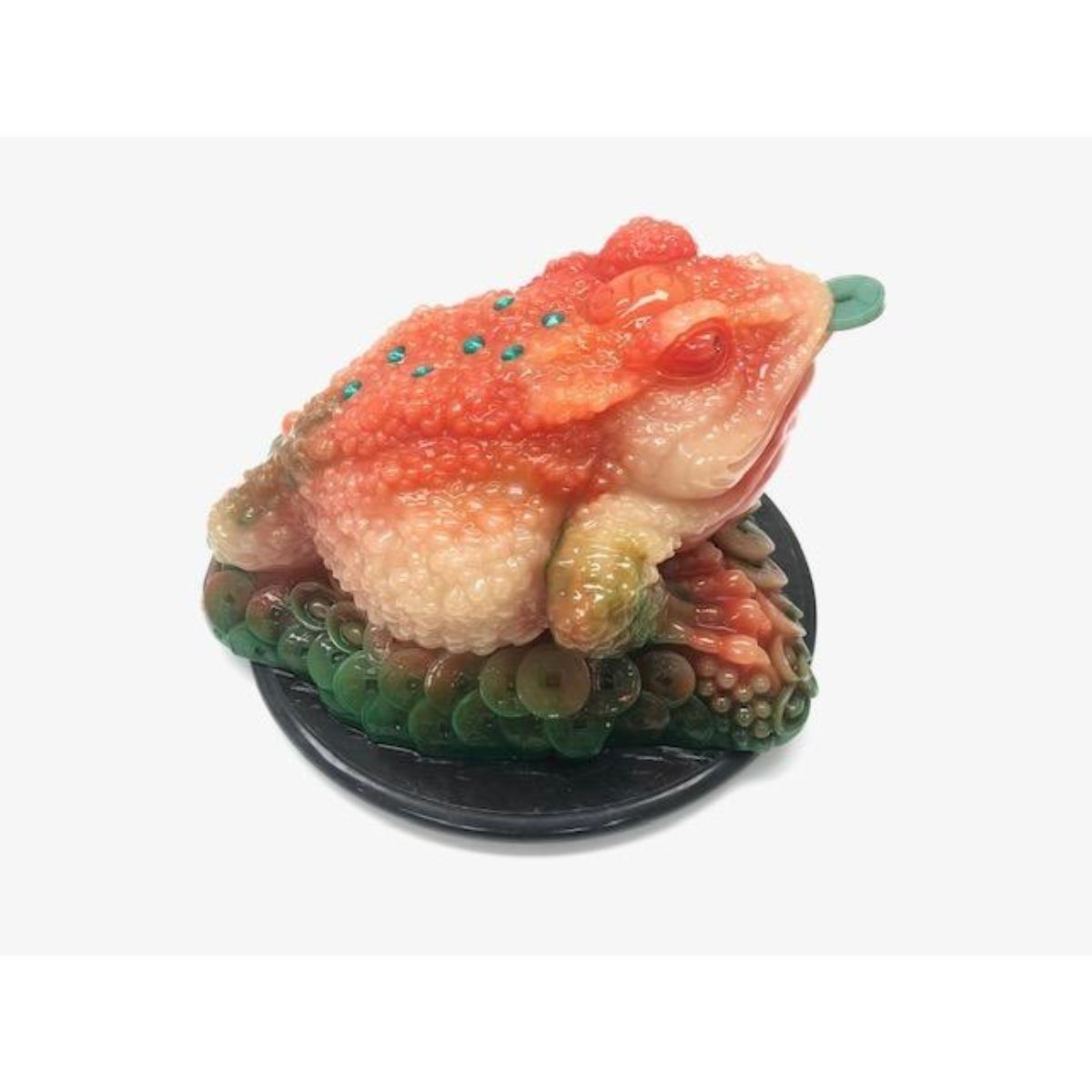 Red, Green And White Money Toad With Red Semi-Precious Stones Sitting On Ingots And Coins. The Jin Chan - Money Toad Is Depicted As A Bullfrog With Red Eyes, Flared Nostrils, And One Hind Leg, Sitting On A Pile Of Traditional Chinese Cash With A Coin In It's Mouth. According To Feng Shui Beliefs, Jin Chan Helps Attract And Protect Wealth, And Guards Against Bad Luck. Because It Symbolizes The Flow Of Money, Jin Chan Should Never Be Positioned Facing The Main Door (Outwards)