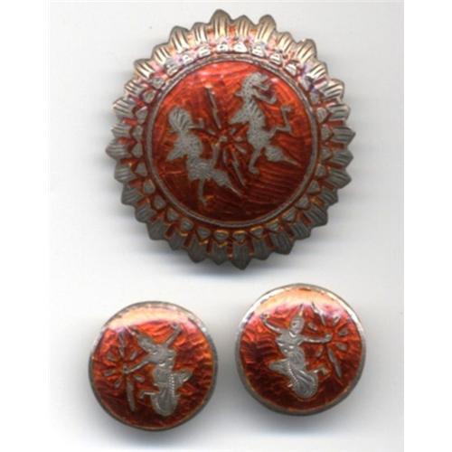 Unusual and lovely sterling silver "Siam Sterling" Thai dancer brooch and clip on earrings with intense red gilloche enameling. It is 1 1/2" in diameter. The earrings are 7/8" in diameter. It is similar to the Niello jewelry made from the 1920's to 1970's in Thailand. Many solders stationed in S.E. Asia during WWII, the Korean and Vietnam war would send home or bring back much of this lovely handcrafted jewelery to the USA as gifts to loved ones. <p> The condition of this one is excellent. It has a lovely dark patina over the silver that is showing. It is marked Saim Sterling on the back but most of that mark has worn off.