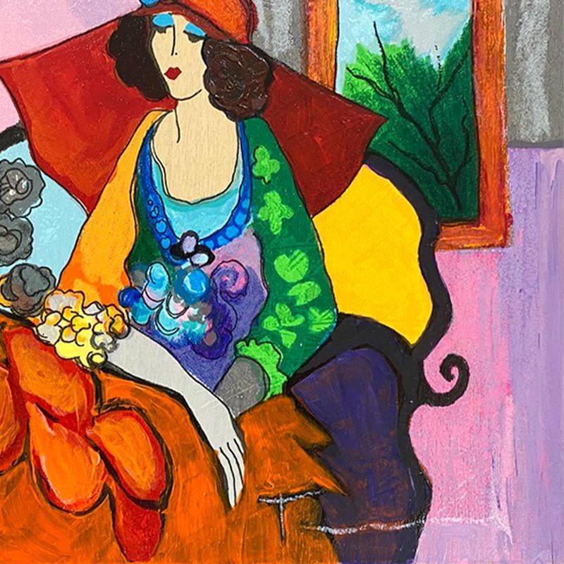 "Red Hat" is a one-of-a-kind mixed media over paint on wood by Itzchak Tarkay (1935-2012), hand signed by the artist. Includes Letter of Authenticity. Measures approx. 9" x 12" (image).
