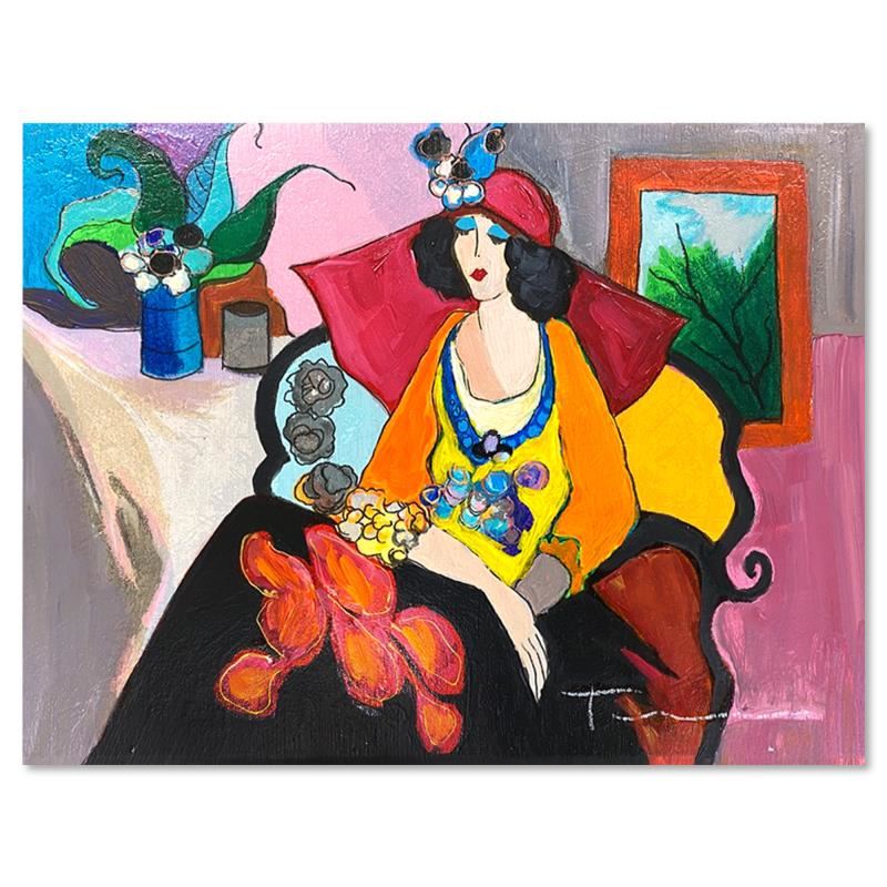 "Red Hat" is a one-of-a-kind mixed media over paint on wood by Itzchak Tarkay (1935-2012), hand signed by the artist. Includes Letter of Authenticity. Measures approx. 9" x 12" (image).