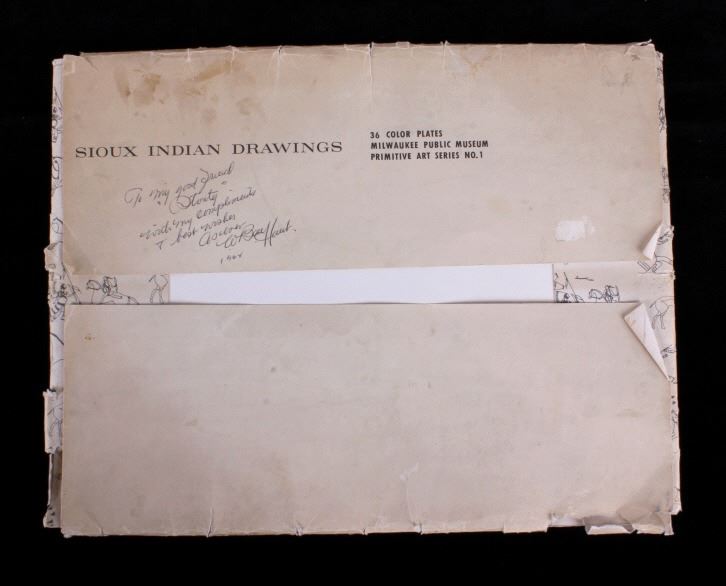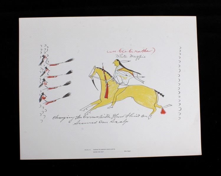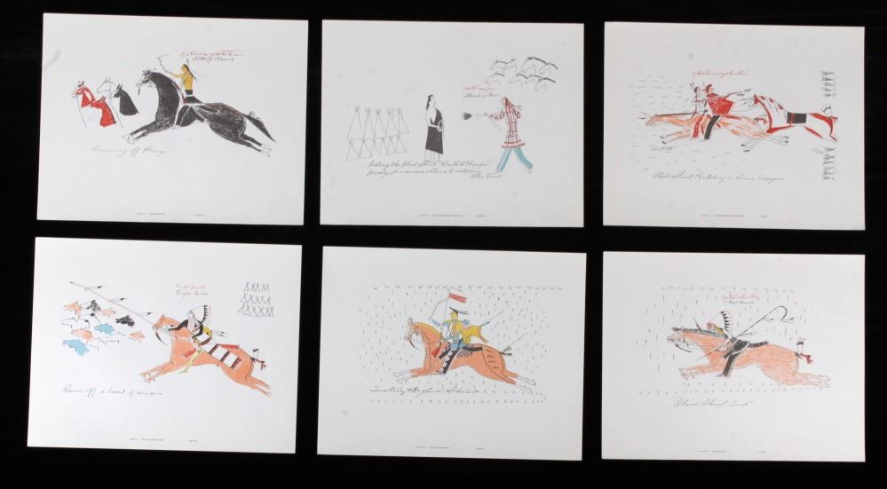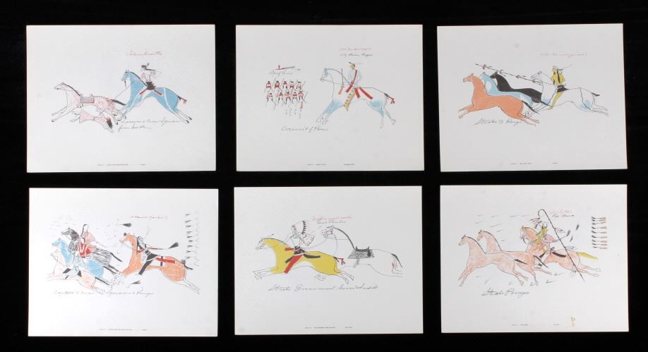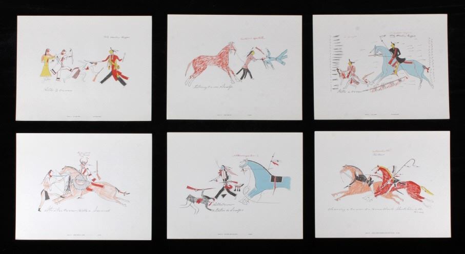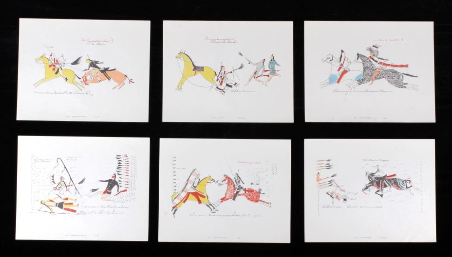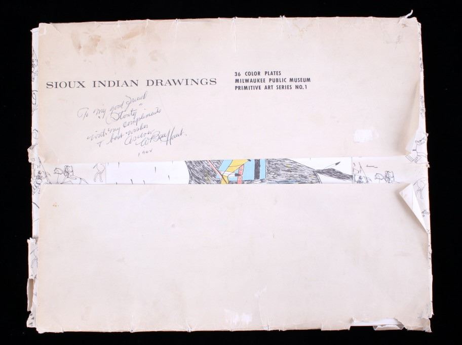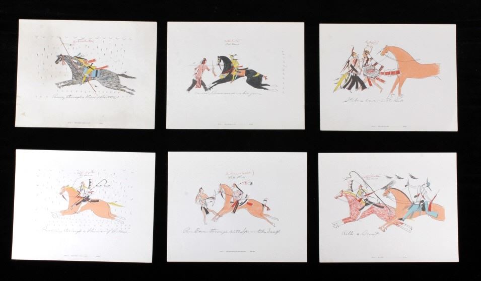 This is an outstanding set of Lakota Sioux Ledger Art prints of the Red Hawk Ledger Art Book captured at the Battle of Wounded Knee, 1890. The prints were produced by the Milwaukee Public Museum and were titled, “Primitive Art Series No. 1” showing 35 color plates. Each print, which is completely unique is marked along the bottom with the plate number, title and artist. The artist included are such important historic Indians as; Red Hawk, White Shield, No Braid, Shows the Feather, Holy Standing Bear, Holy Standing Buffalo, Quick Thunder, Sitting Hawk, Eagle Crow, Standing Bear, and White Magpie. The set appears to be complete with all 36 color plates and the original holder. The set was published in 1961 originally from the Red Hawk Ledger Book which was purchased by the museum in 1897 and captured from Red Hawk at Wounded Knee Creek, South Dakota on January 8, 1891 just days after the infamous massacre at Wounded Knee. The artwork is exceptional and is truly a rare and wonderful collection. Each individual print measures 15.25”x13”. Ledger drawings by Cetanluta (Red Hawk), Pte Wakannajiu (Holy Standing Buffalo), Unklekiraska (White Magpie), Matoniyaluta (Red Living Bear), Matonajiu (Standing Bear), Kangi Wanbli (Eagle Crow), Cetaniyotake (Sitting Hawk), Cetan Wa miniyomini (Whirlwind Hawk), Wakinyano ranko (Quick Thunder), Itkaminyanke, Ki Sunsui (No Braid), and Wiyaluaofra Zan (Shows the Feather)