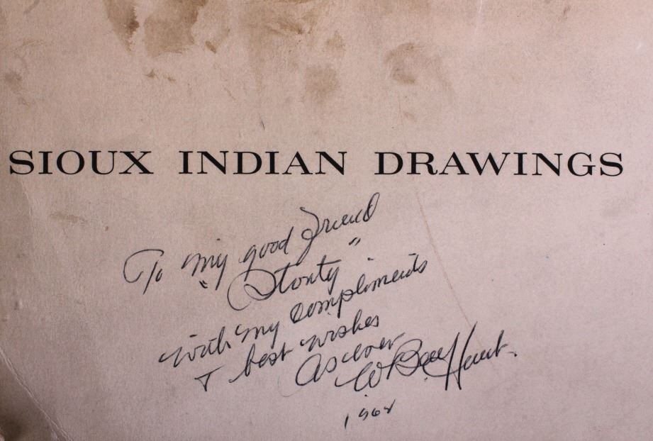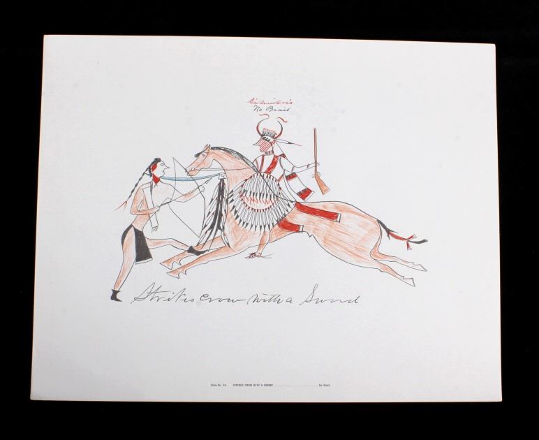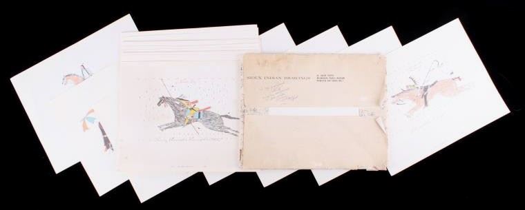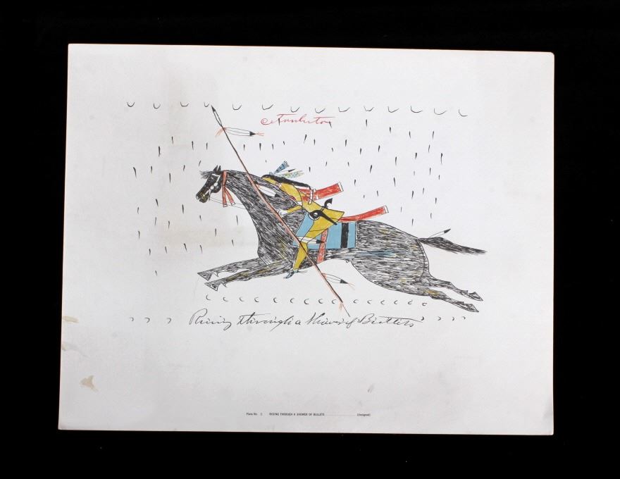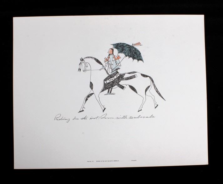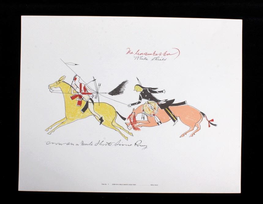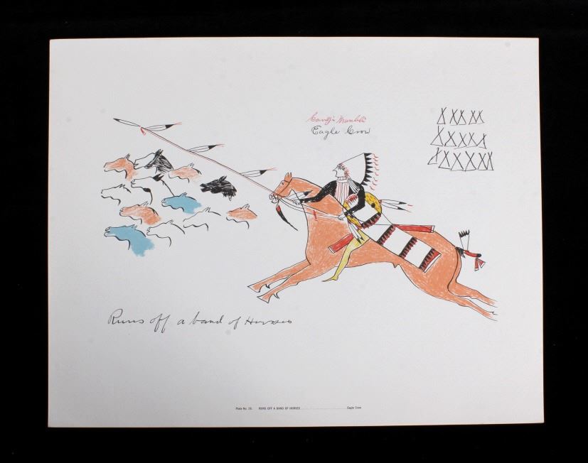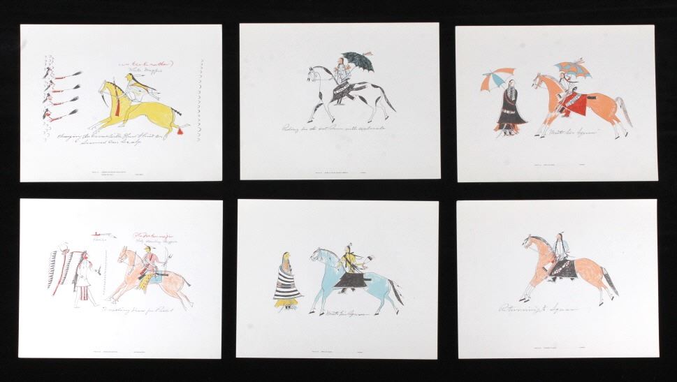 This is an outstanding set of Lakota Sioux Ledger Art prints of the Red Hawk Ledger Art Book captured at the Battle of Wounded Knee, 1890. The prints were produced by the Milwaukee Public Museum and were titled, “Primitive Art Series No. 1” showing 35 color plates. Each print, which is completely unique is marked along the bottom with the plate number, title and artist. The artist included are such important historic Indians as; Red Hawk, White Shield, No Braid, Shows the Feather, Holy Standing Bear, Holy Standing Buffalo, Quick Thunder, Sitting Hawk, Eagle Crow, Standing Bear, and White Magpie. The set appears to be complete with all 36 color plates and the original holder. The set was published in 1961 originally from the Red Hawk Ledger Book which was purchased by the museum in 1897 and captured from Red Hawk at Wounded Knee Creek, South Dakota on January 8, 1891 just days after the infamous massacre at Wounded Knee. The artwork is exceptional and is truly a rare and wonderful collection. Each individual print measures 15.25”x13”. Ledger drawings by Cetanluta (Red Hawk), Pte Wakannajiu (Holy Standing Buffalo), Unklekiraska (White Magpie), Matoniyaluta (Red Living Bear), Matonajiu (Standing Bear), Kangi Wanbli (Eagle Crow), Cetaniyotake (Sitting Hawk), Cetan Wa miniyomini (Whirlwind Hawk), Wakinyano ranko (Quick Thunder), Itkaminyanke, Ki Sunsui (No Braid), and Wiyaluaofra Zan (Shows the Feather)