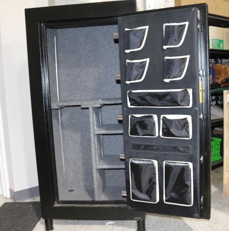 Measures: 59"H x 30"W x 22"D. Black exterior color with chrome handle and combination dial. LOCAL PICKUP ONLY!
