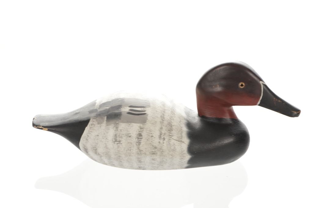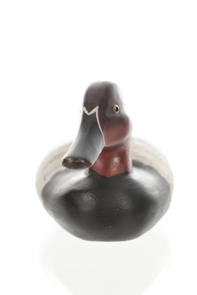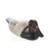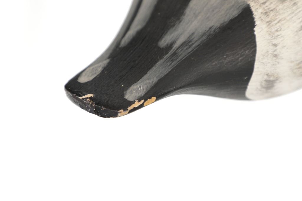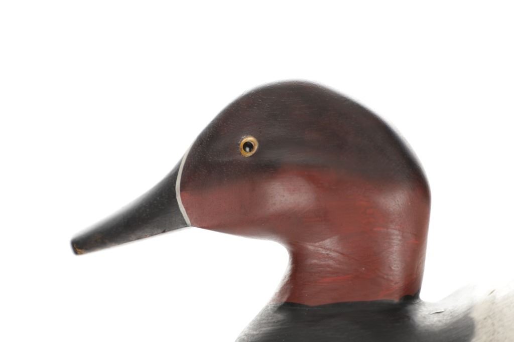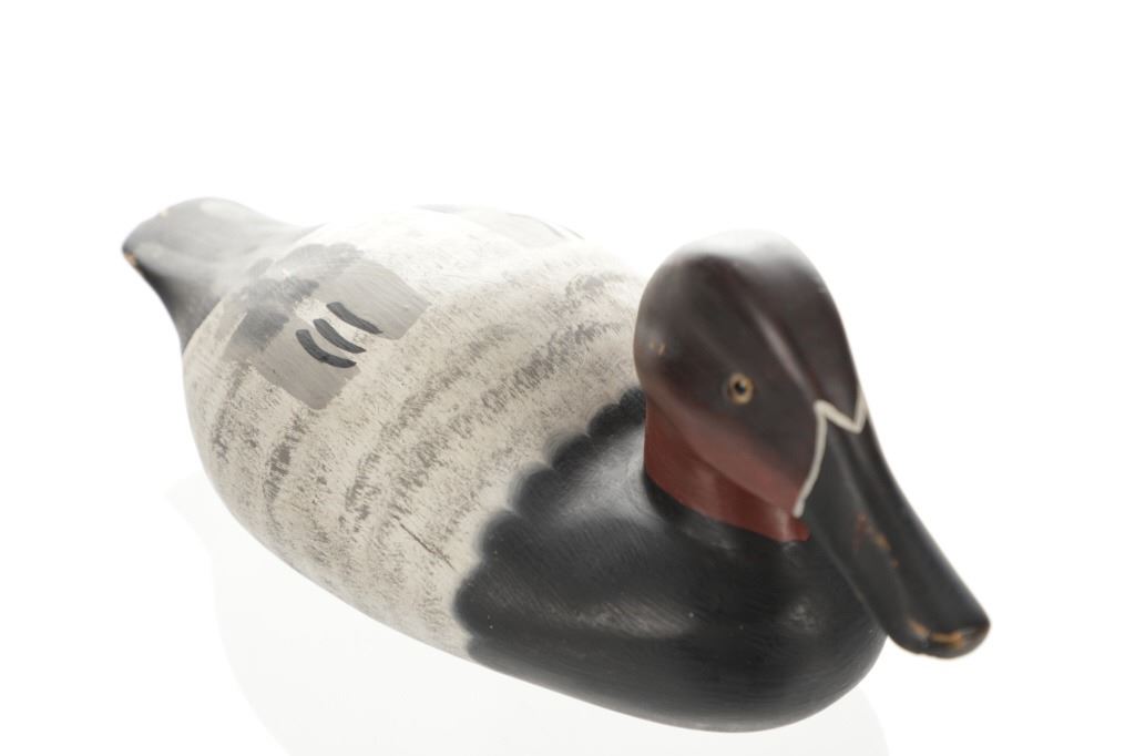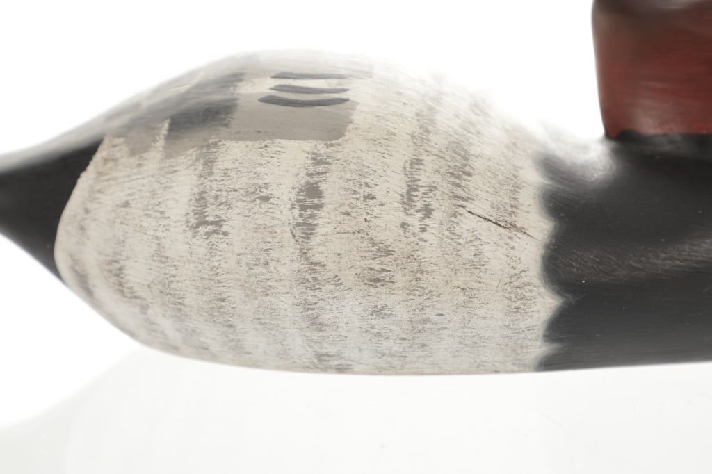 Featured in this lot is this Red-Headed Pochard hand carved duck decoy. The decoy features a wonderfully and professionally crafted softwood construction that shows a decoy that features the likeness of a Red-Headed Pochard that shows a black bill and a red head with glass eyes and a black and white body. The condition of this duck decoy is good with slight wear to the bill of the duck and its tail but otherwise shows good overall condition. The measurements of this duck decoy is 5 1/2" x 14" x 5 1/2"
