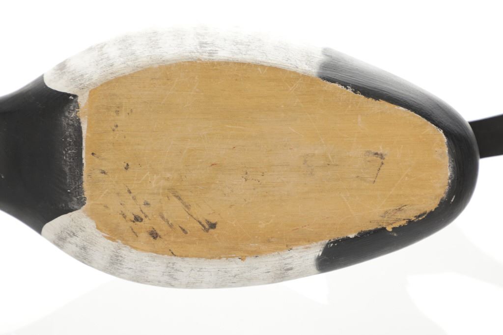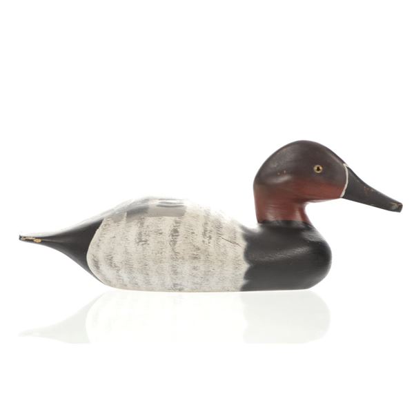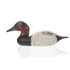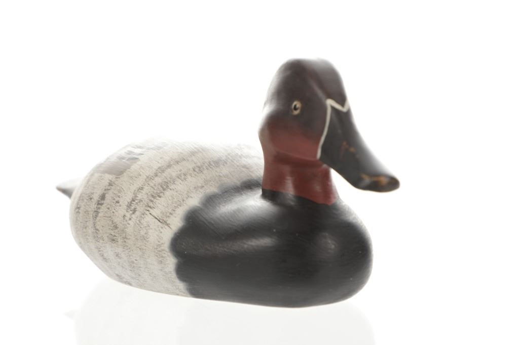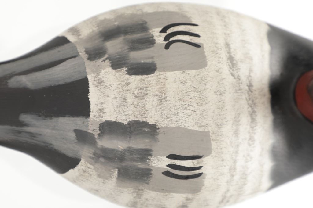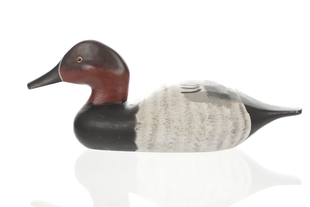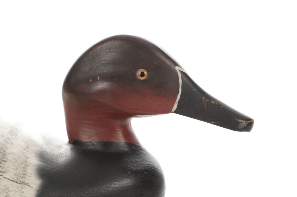 Featured in this lot is this Red-Headed Pochard hand carved duck decoy. The decoy features a wonderfully and professionally crafted softwood construction that shows a decoy that features the likeness of a Red-Headed Pochard that shows a black bill and a red head with glass eyes and a black and white body. The condition of this duck decoy is good with slight wear to the bill of the duck and its tail but otherwise shows good overall condition. The measurements of this duck decoy is 5 1/2" x 14" x 5 1/2"