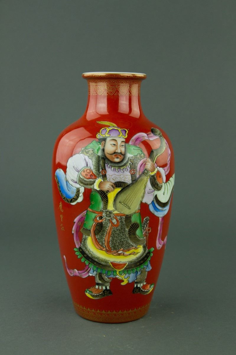 Chinese red ground Famille Rose porcelain vase; of ovoid body with waisted neck; featuring portrait of Heavenly Kings along with gilt script calligraphy; six-character Qianlong mark on base; H: 28 cm, D: 14 cm, 982 grams