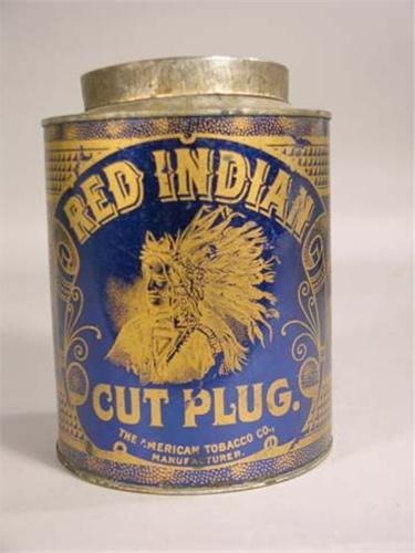 Red Indian cut plug tobacco tin, blue & gold, 6" tall, factory #2 Maryland. Very good cond. with some minor paint chips.