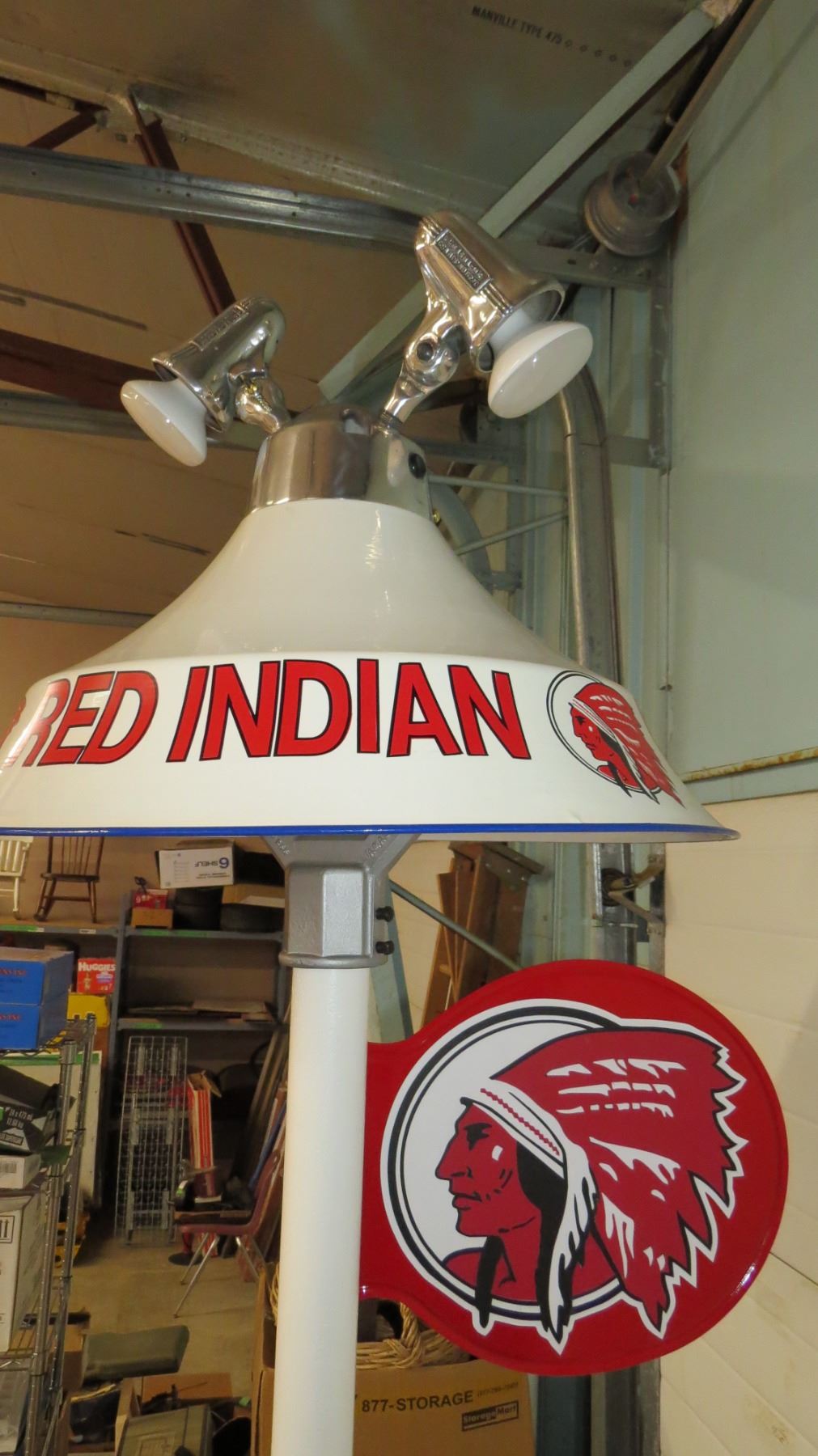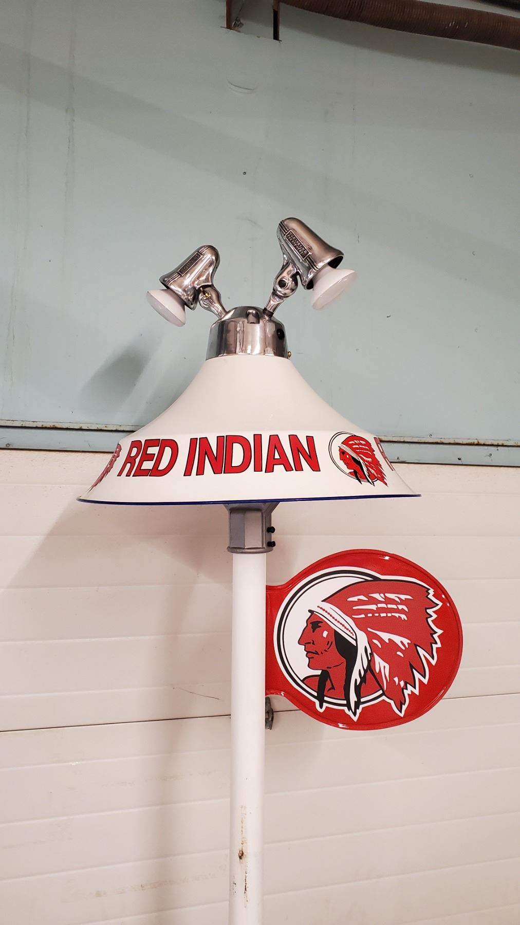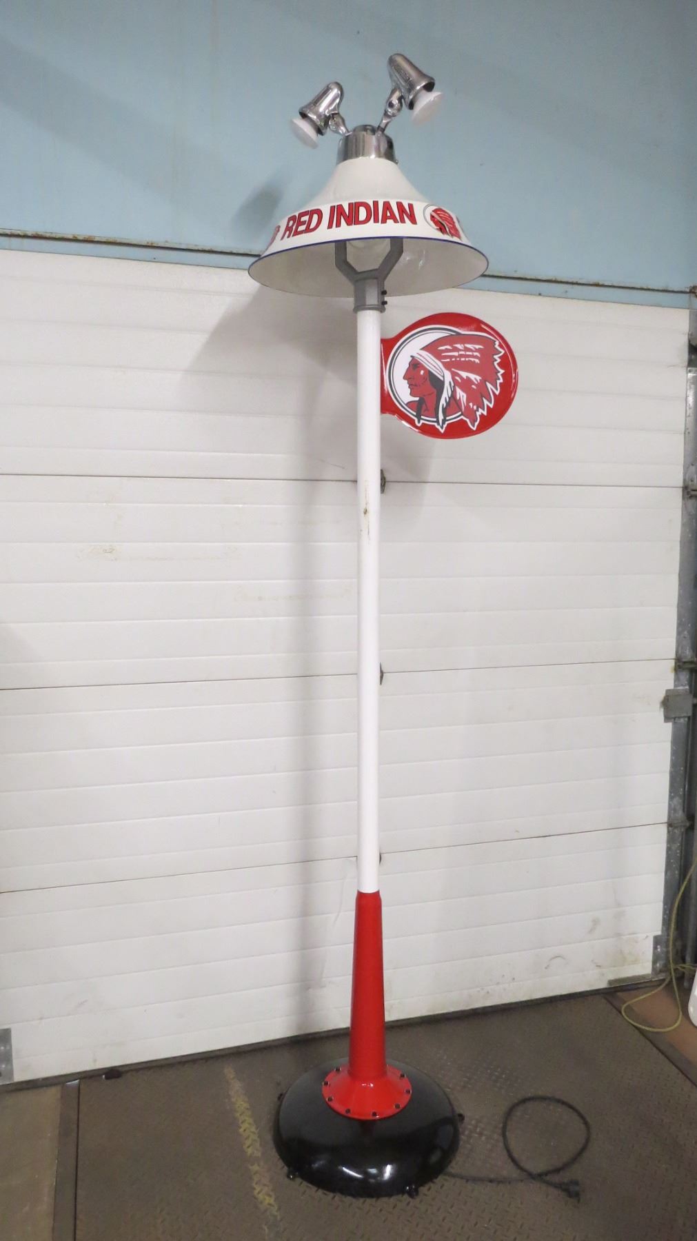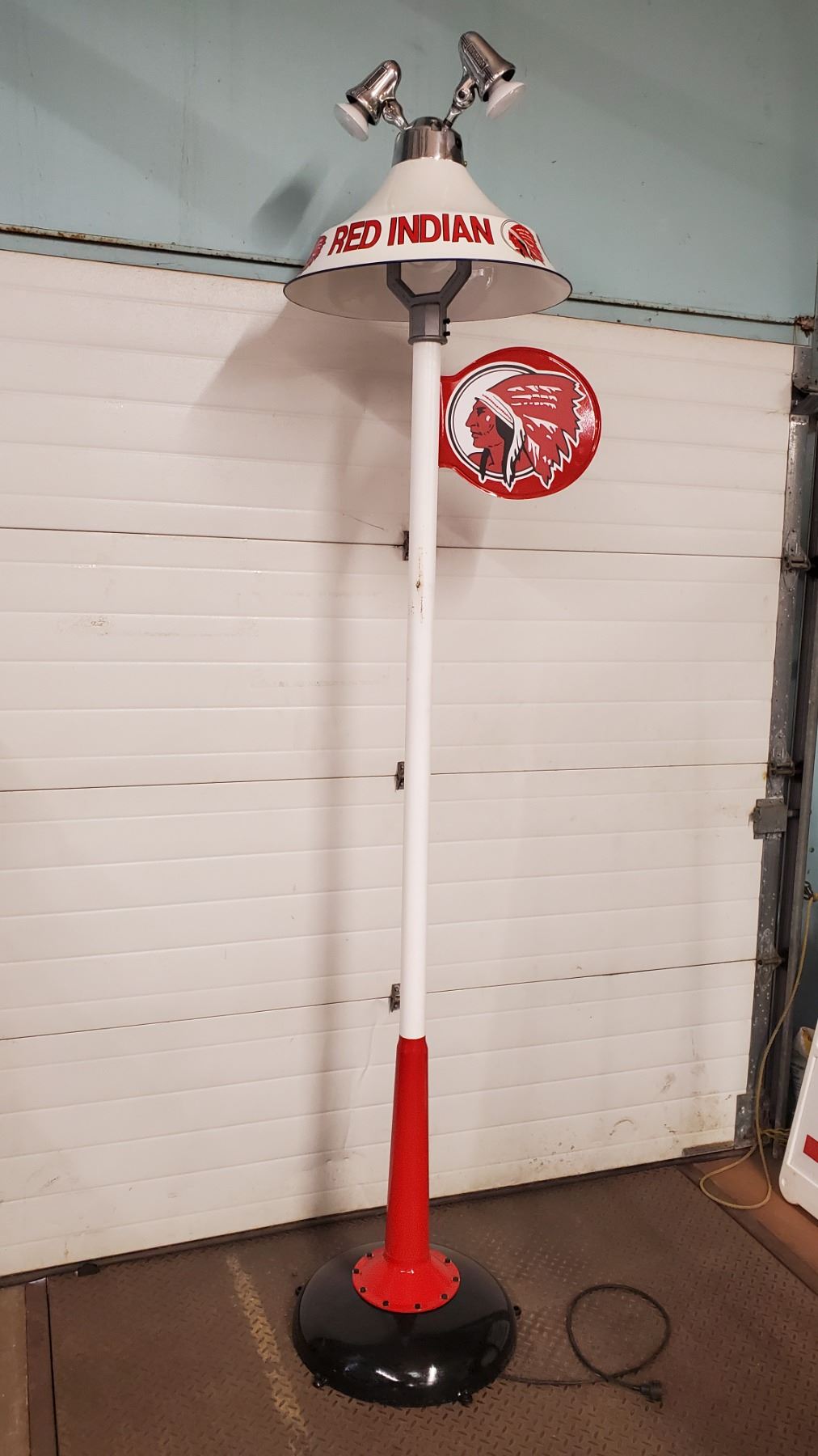 Red Indian Gas Pump Lamp Post - Electric - approx 10ft tall (tin flange + shade by decal)