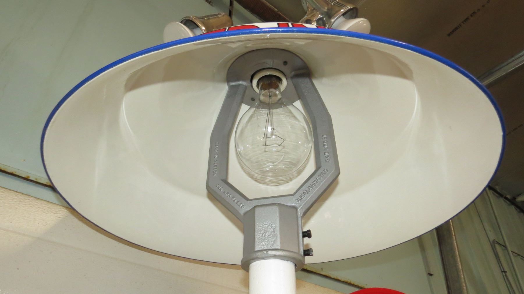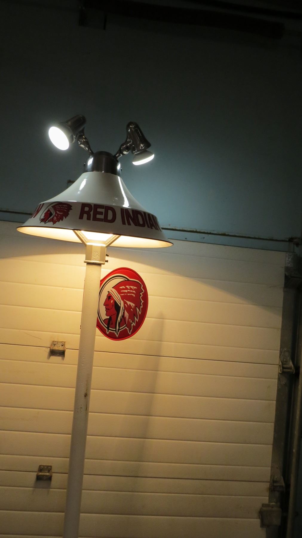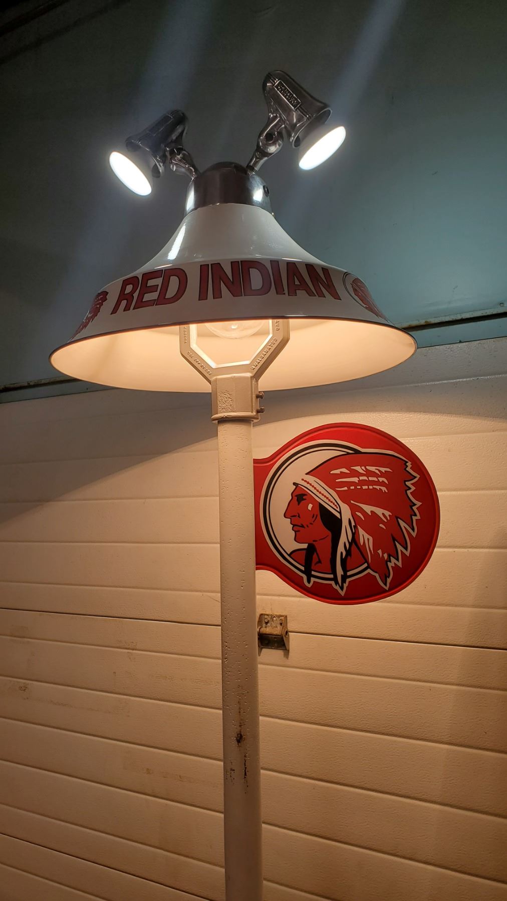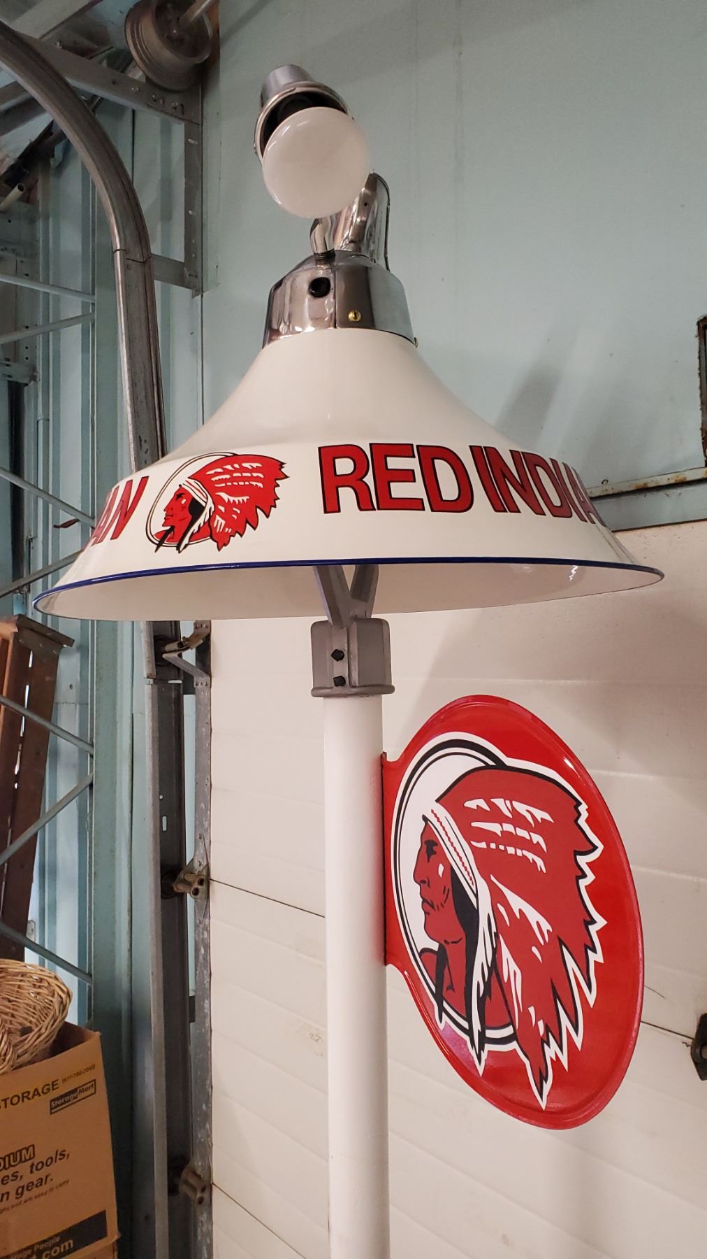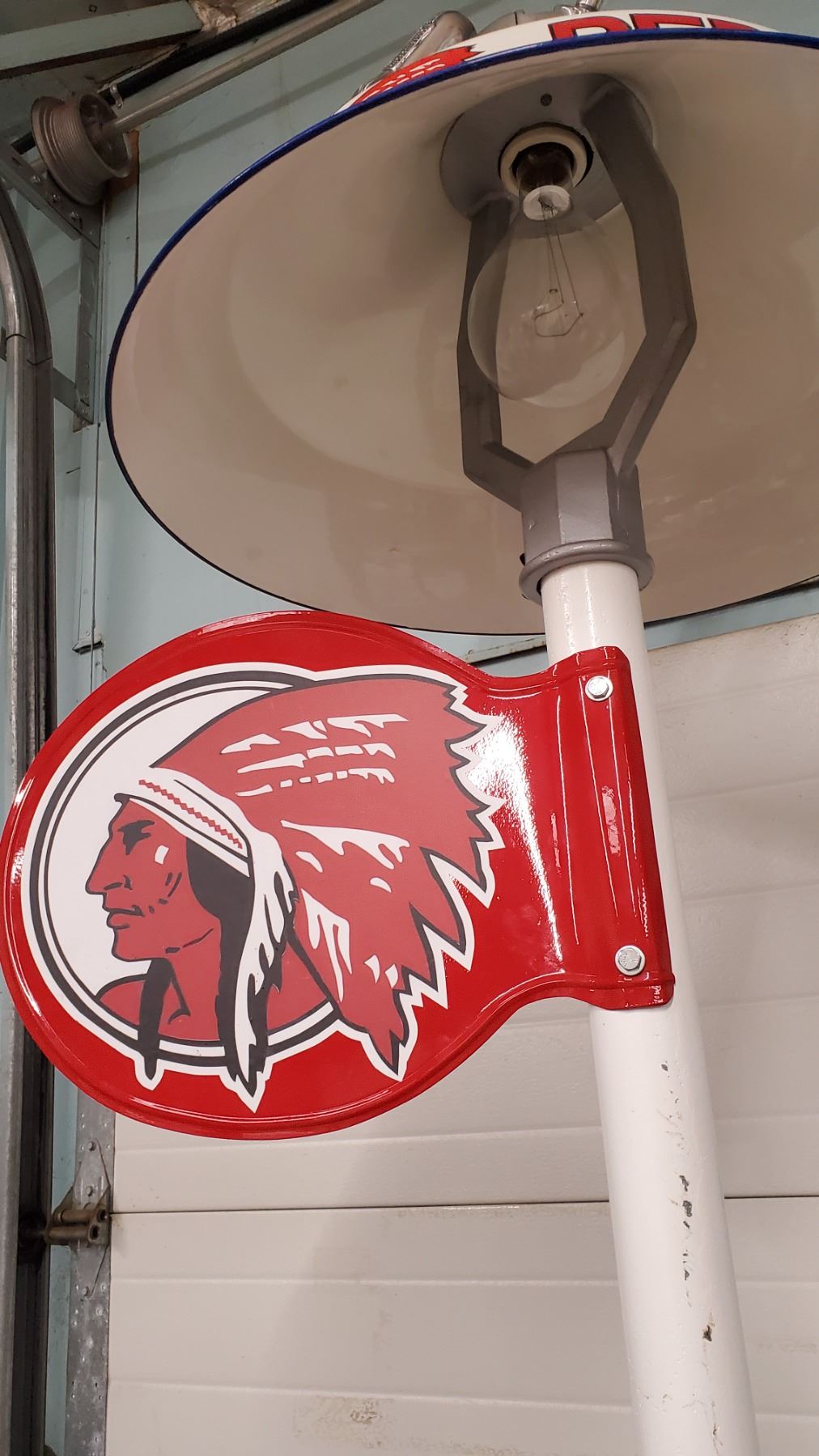 Red Indian Gas Pump Lamp Post - Electric - approx 10ft tall (tin flange + shade by decal)