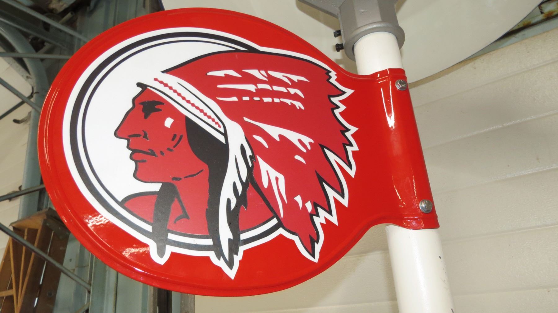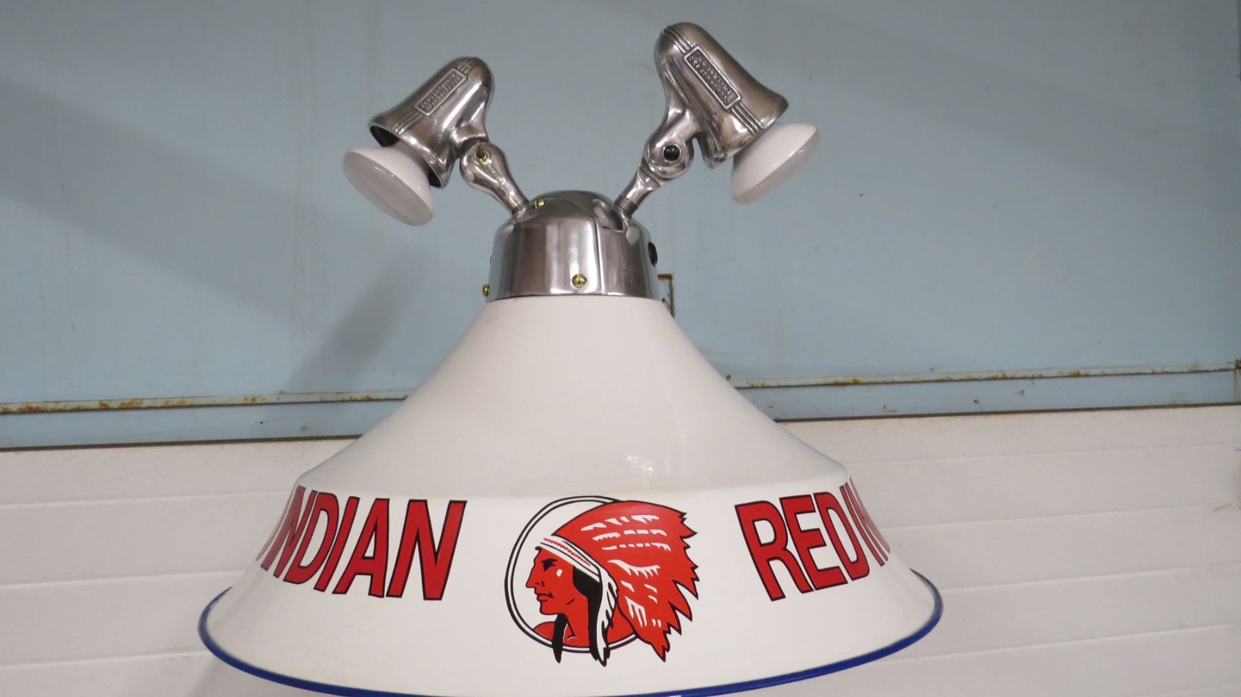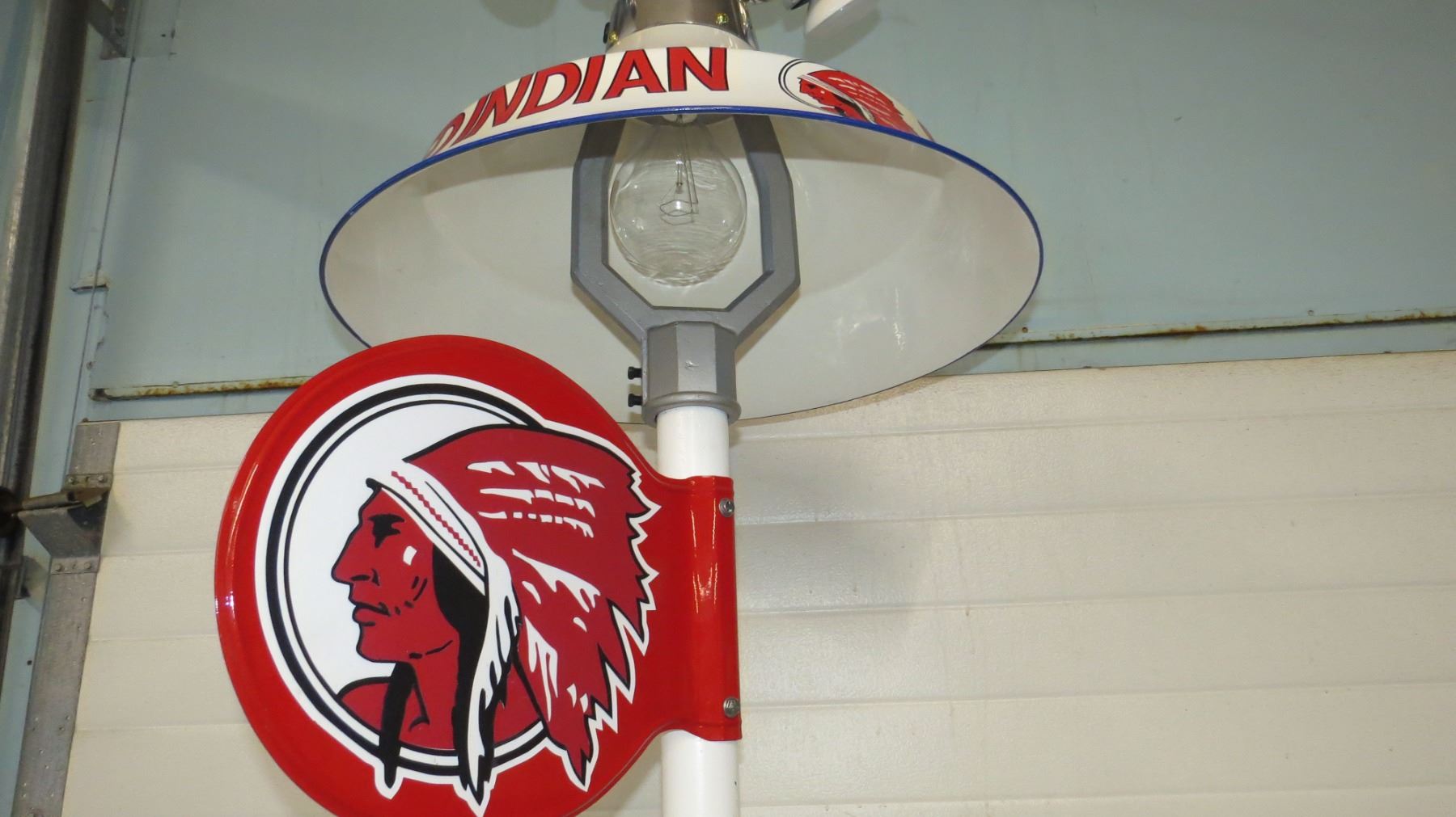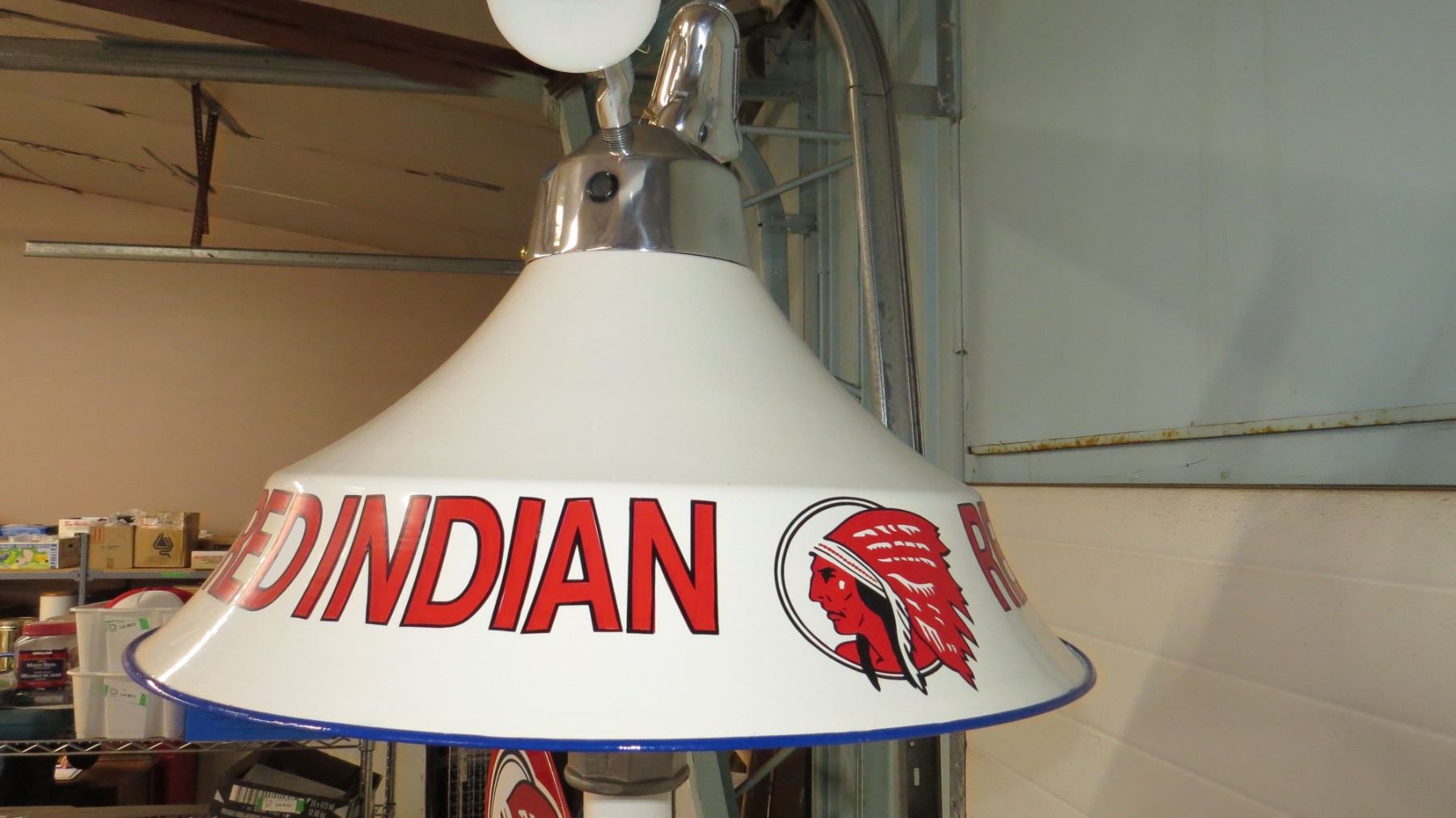Red Indian Gas Pump Lamp Post - Electric - approx 10ft tall (tin flange + shade by decal)