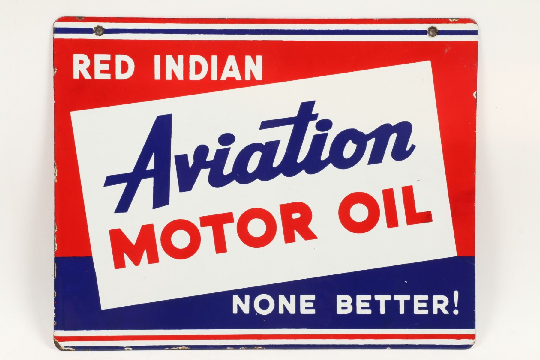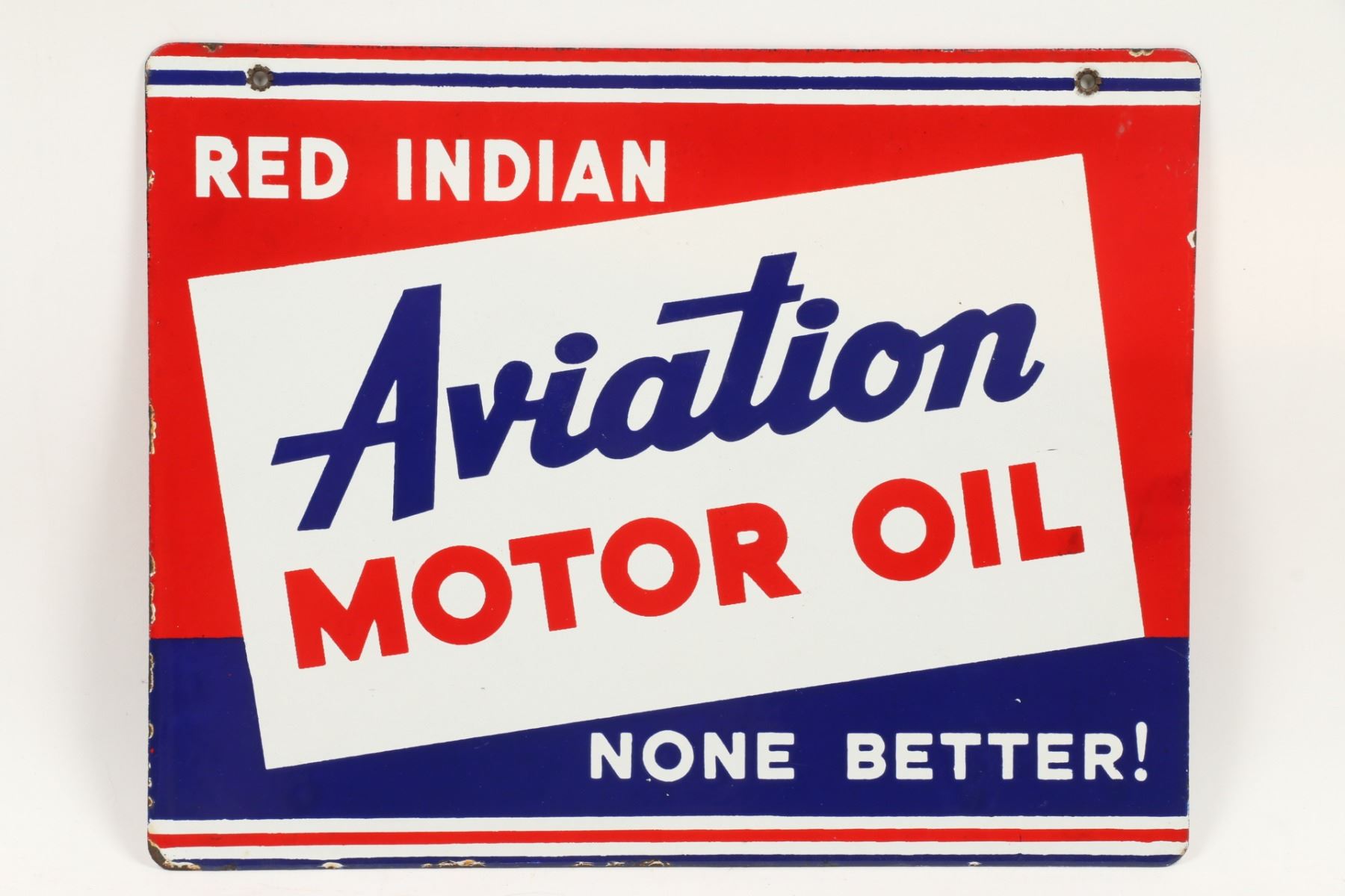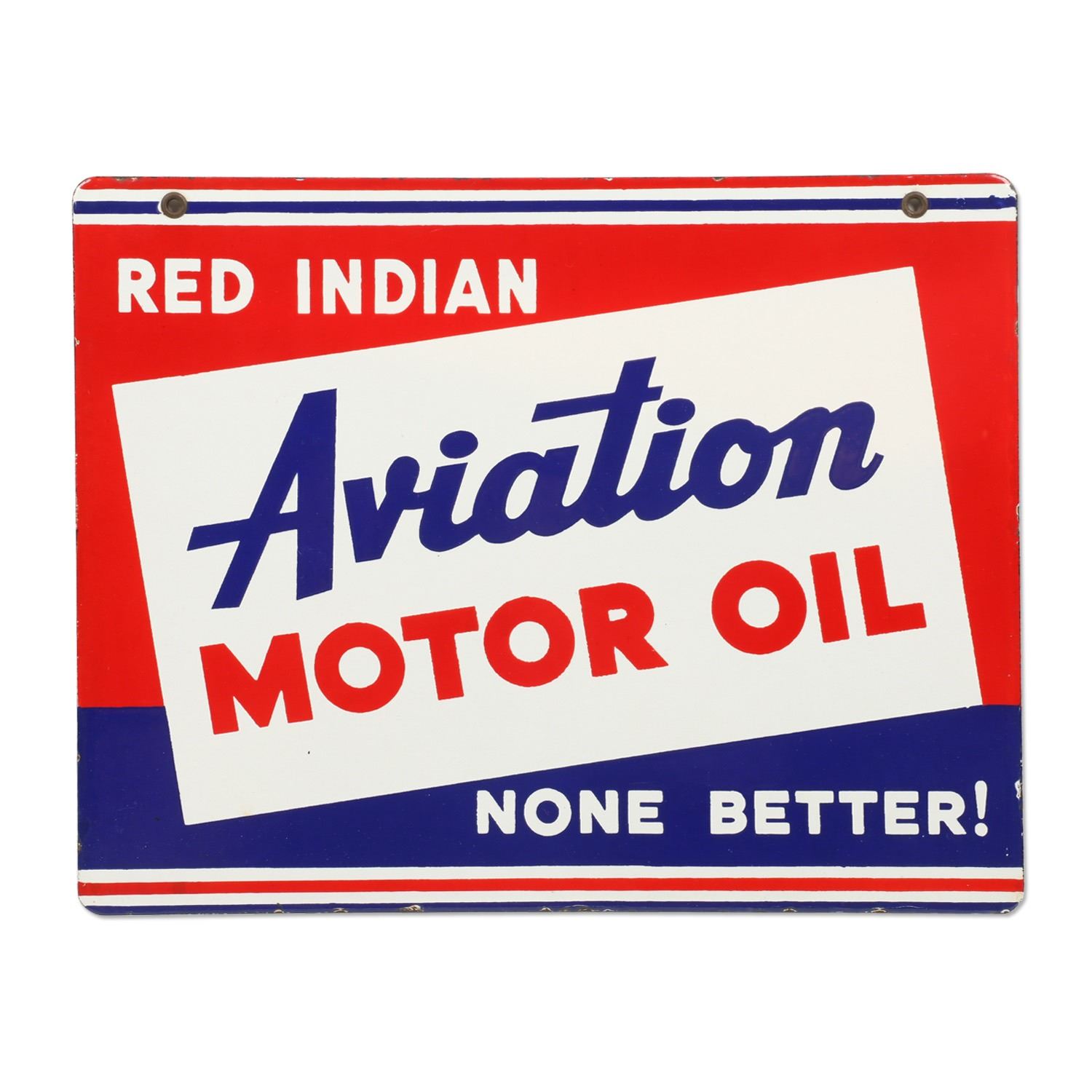 Canadian. Circa 1930. Two-sided. Red Indian "Aviation" Motor Oil. 14" x 11". Minor edge chips. $2000-2500.